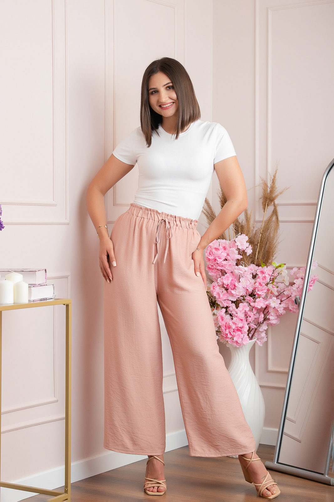 Pantaloni palazzo Nicole cu snur in talie - Roz pudrat