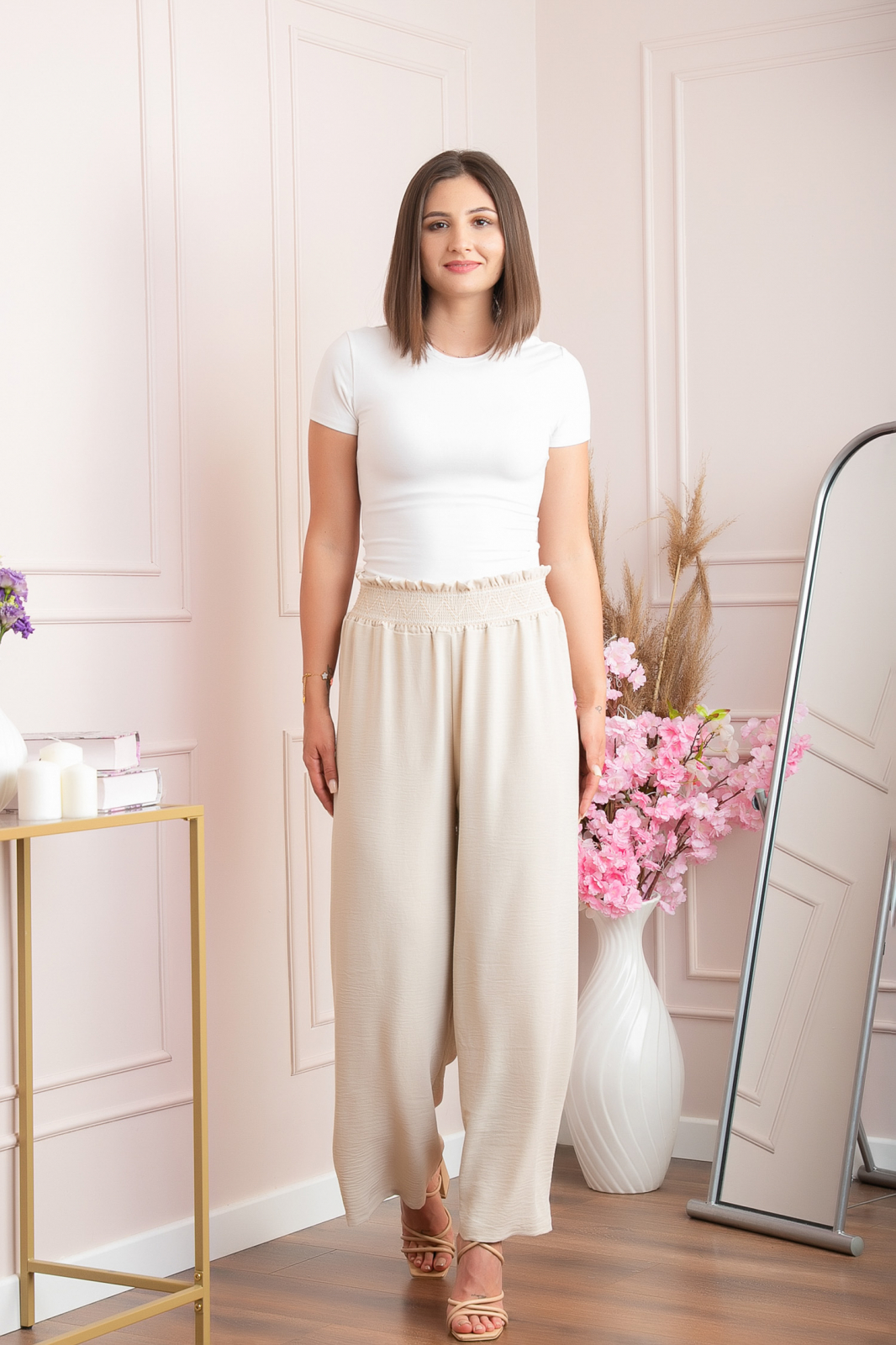 Acesti pantaloni aduc in garderoba ta combinatia ideala intre confortul unei talii elastice si aspectul sofisticat dat de broderia contrastanta in zig-zag, lucrata pe o banda smock ce evidentiaza zona taliei. Fabricati dintr-o tesatura usoara, care lasa pielea sa respire, pantalonii cad fluid pe picior, cu un croi wide-leg ce alungeste silueta si ofera libertate de miscare. Lungimea pana aproape de glezna ii face potriviti atat pentru tinute office chic cu sacou si tocuri, cat si pentru look-uri casual cu sandale sau sneakers, in sezoanele calde de primavara si vara. Acesti pantaloni sunt piesa statement care imbina stilul boho modern cu utilitatea zilnica, fiind usor de integrat in diverse tinute.