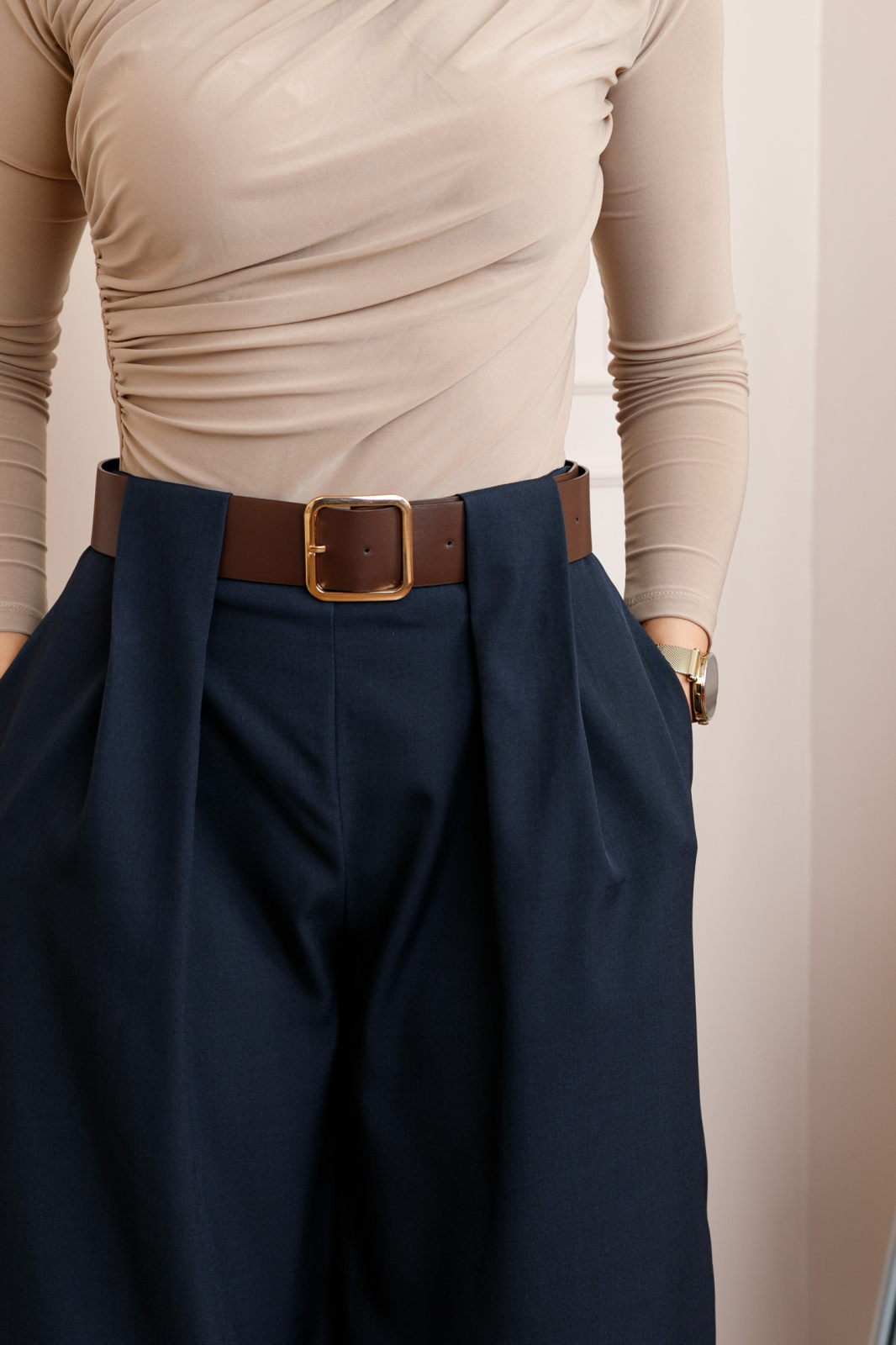 Talie inalta este evidentiata de cureaua reglabila, care accentueaza subtil zona taliei, in timp ce elasticul discret din partea din spate asigura confort si adaptabilitate pe parcursul intregii zile. Pensele din fata adauga un plus de structura si eleganta, iar buzunarele laterale sunt functionale si practice.