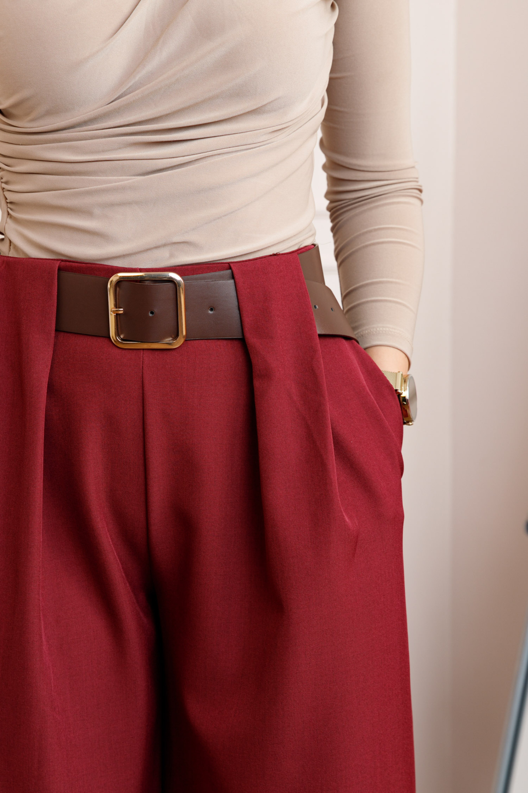 Talie inalta este evidentiata de cureaua reglabila, care accentueaza subtil zona taliei, in timp ce elasticul discret din partea din spate asigura confort si adaptabilitate pe parcursul intregii zile. Pensele din fata adauga un plus de structura si eleganta, iar buzunarele laterale sunt functionale si practice.