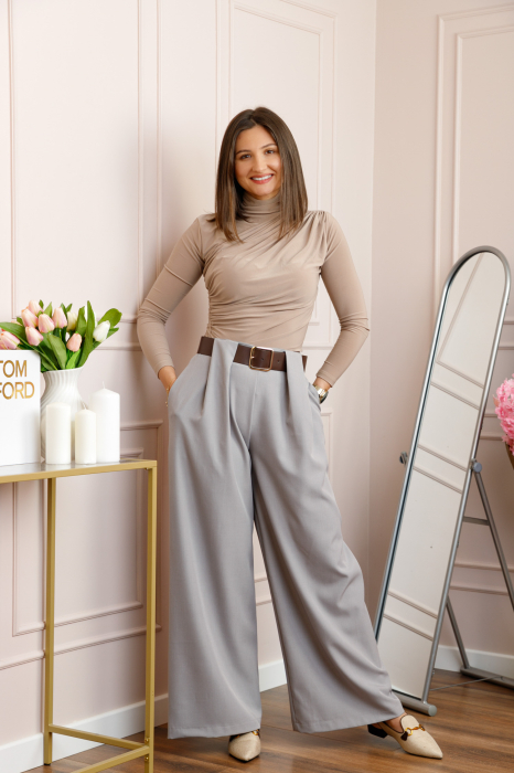 Pantaloni dama gri cu croi larg, talie inalta, elastic la spate si curea reglabila. Model elegant cu buzunare laterale, material confortabil, ideal pentru tinute office sau casual.