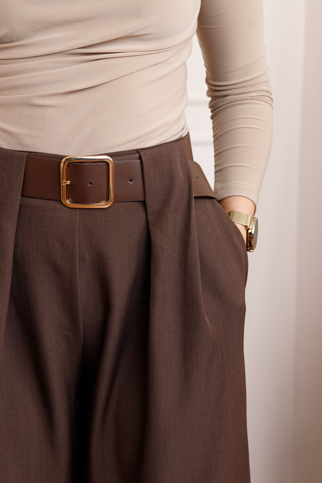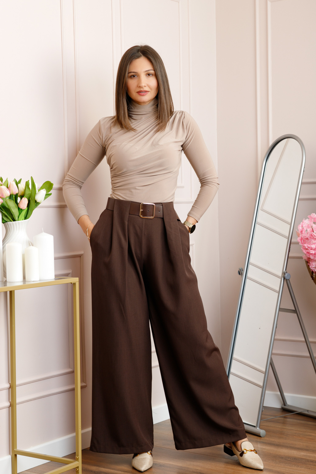 Pantaloni dama maro cu croi larg, talie inalta, elastic la spate si curea reglabila. Model elegant cu buzunare laterale, material confortabil, ideal pentru tinute office sau casual.