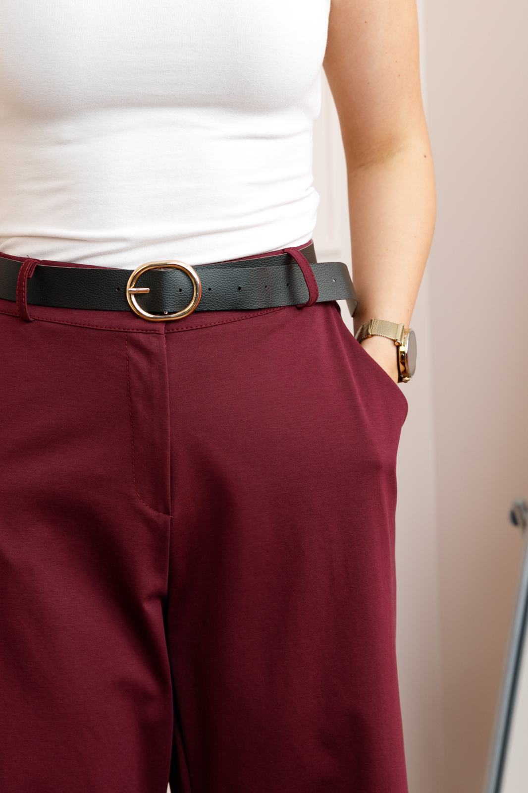Talie este completata de elastic discret in partea din spate, ceea ce asigura o adaptare confortabila pe corp, in timp ce inchiderea clasica cu fermoar si nasture mentine un aspect curat si bine definit in partea frontala. Cureaua reglabila accentueaza talia, iar buzunarele laterale functionale sunt practice.