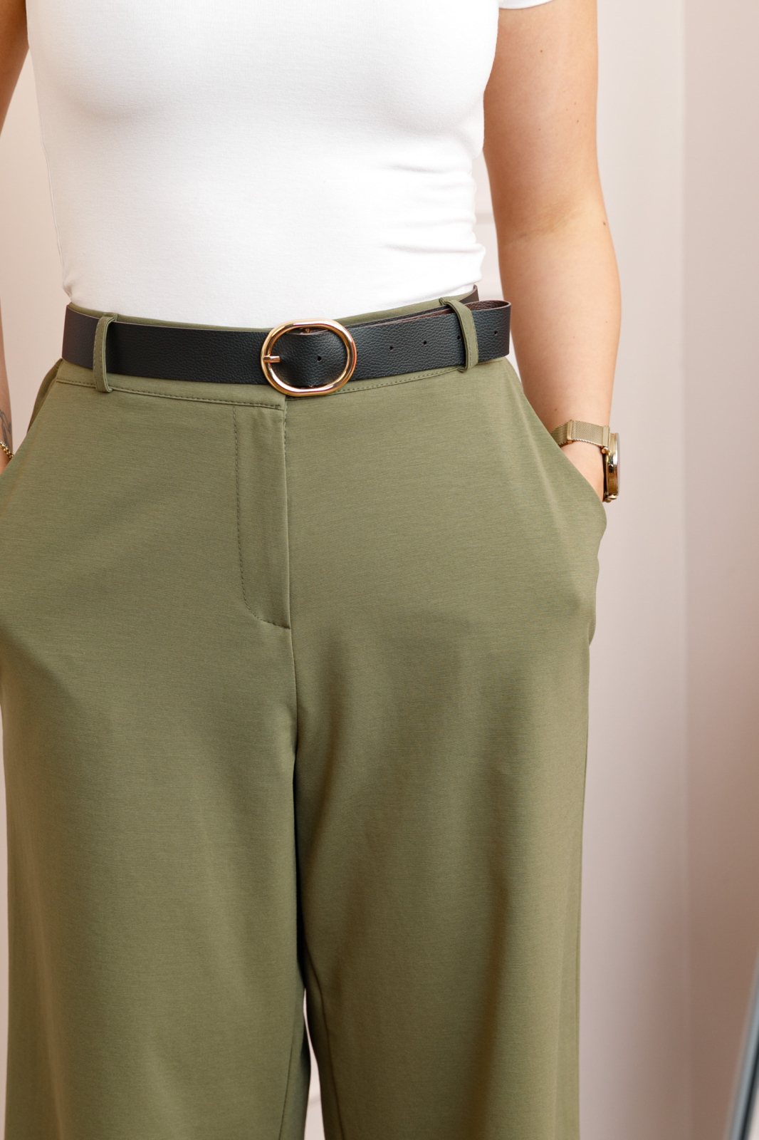 Pantaloni kaki evazati cu talie elastica la spate si curea reglabila Molly