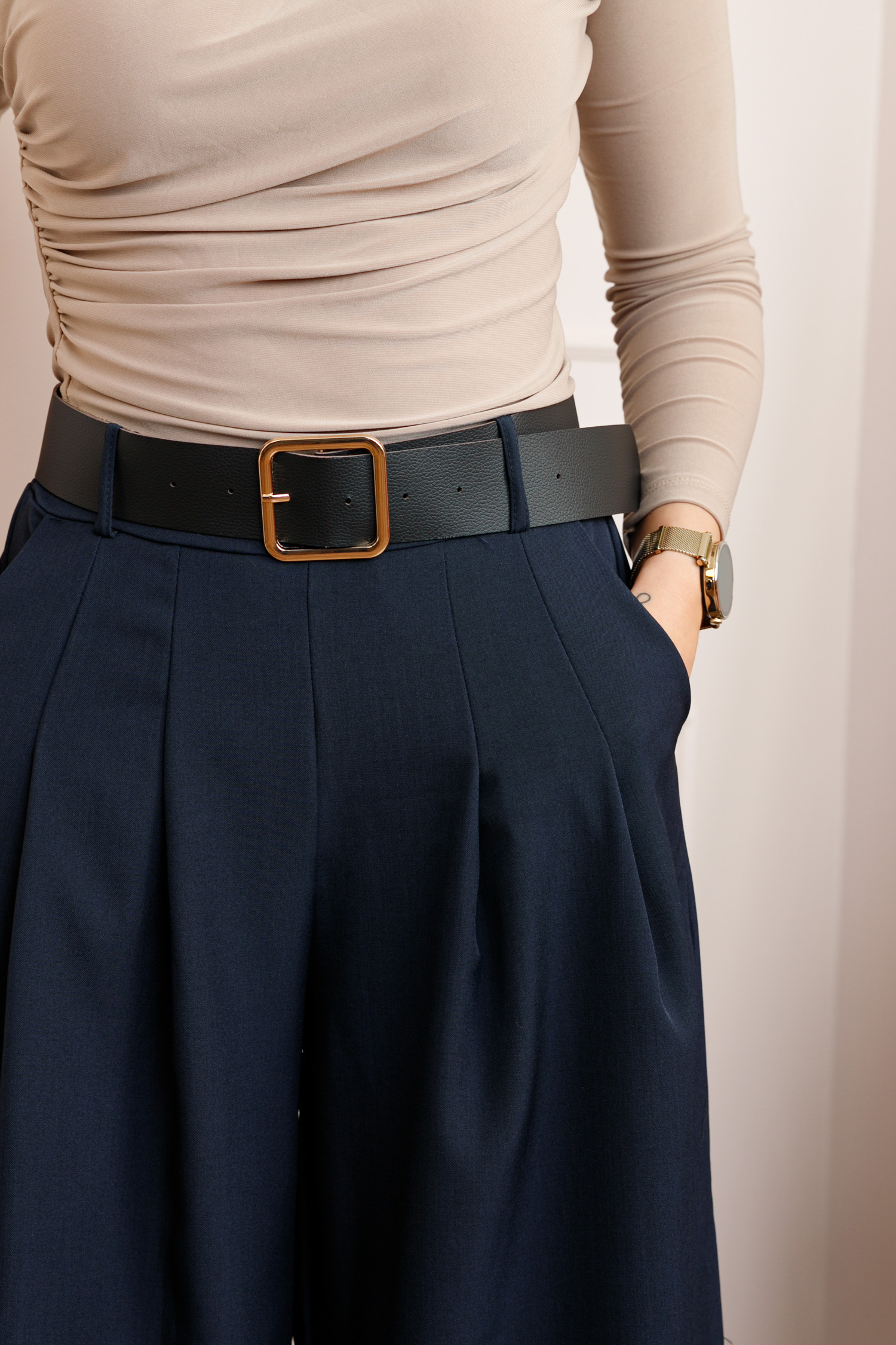 Talie este structurata in partea frontala pentru un aspect curat, iar elasticul discret din spate asigura confort si adaptabilitate pe corp. Cureaua reglabila marcheaza talia si completeaza designul cu un accent modern, in timp ce buzunarele laterale functionale adauga un plus de utilitate.