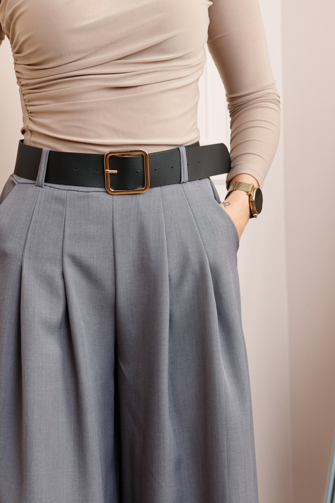 Talie este structurata in partea frontala pentru un aspect curat, iar elasticul discret din spate asigura confort si adaptabilitate pe corp. Cureaua reglabila marcheaza talia si completeaza designul cu un accent modern, in timp ce buzunarele laterale functionale adauga un plus de utilitate.