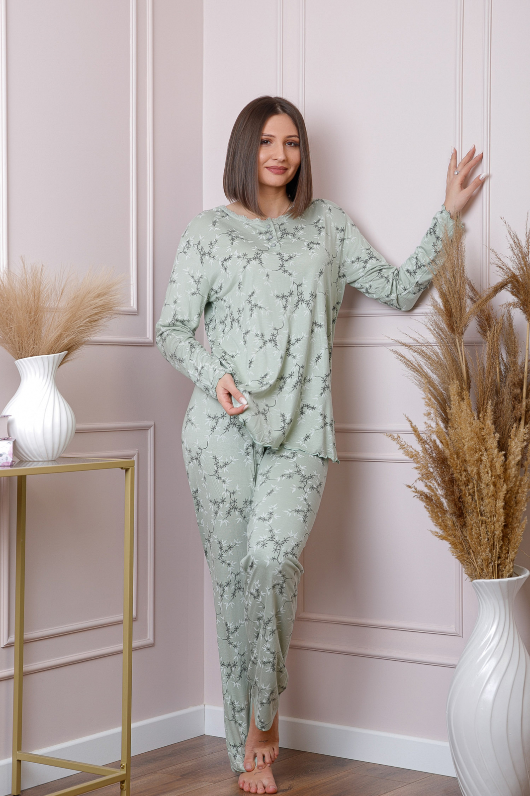 Acest model de pijama plus size este realizat din material moale si elastic, perfect pentru noptile relaxante. Designul elegant include o bluza cu maneci lungi si pantaloni lungi, ambele piese avand un imprimeu floral delicat pe fundal verde pastel, care adauga o nota feminina si moderna. Croiala lejera si materialul respirabil asigura o libertate de miscare excelenta si un somn odihnitor. Modelul din imagine are 174 cm inaltime si poarta marimea XL.