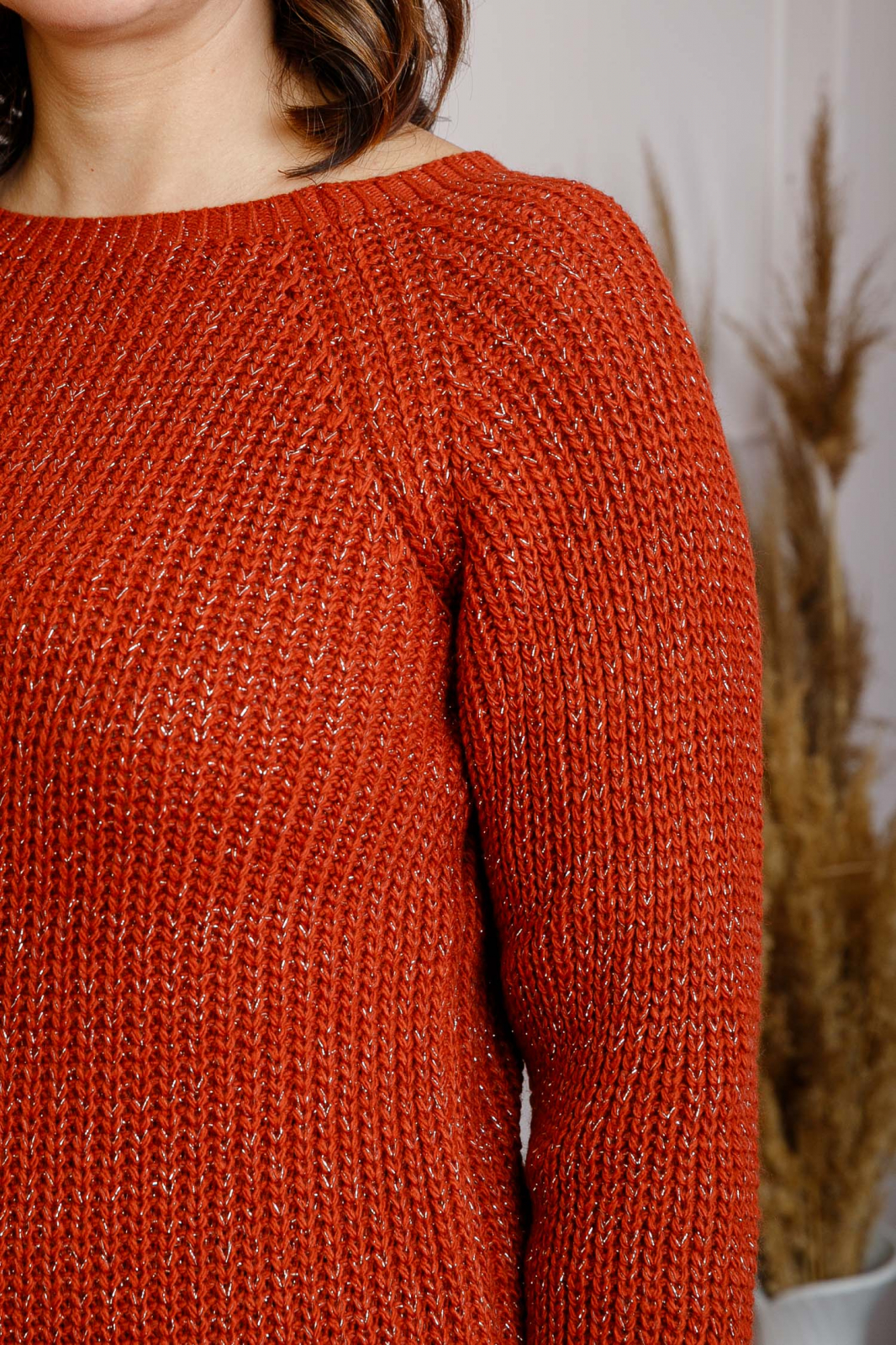 Acest model de pulover tricotat este perfect pentru zilele racoroase de toamna si iarna. Fabricat dintr-un material placut la atingere, acest pulover caramiziu adauga un plus de feminitate oricarui outfit. Cu un croi lejer si maneci lungi, ofera un confort sporit pe parcursul intregii zile. Designul clasic, cu guler rotund, il face usor de asortat atat cu colanti, cat si cu jeansi sau fuste.