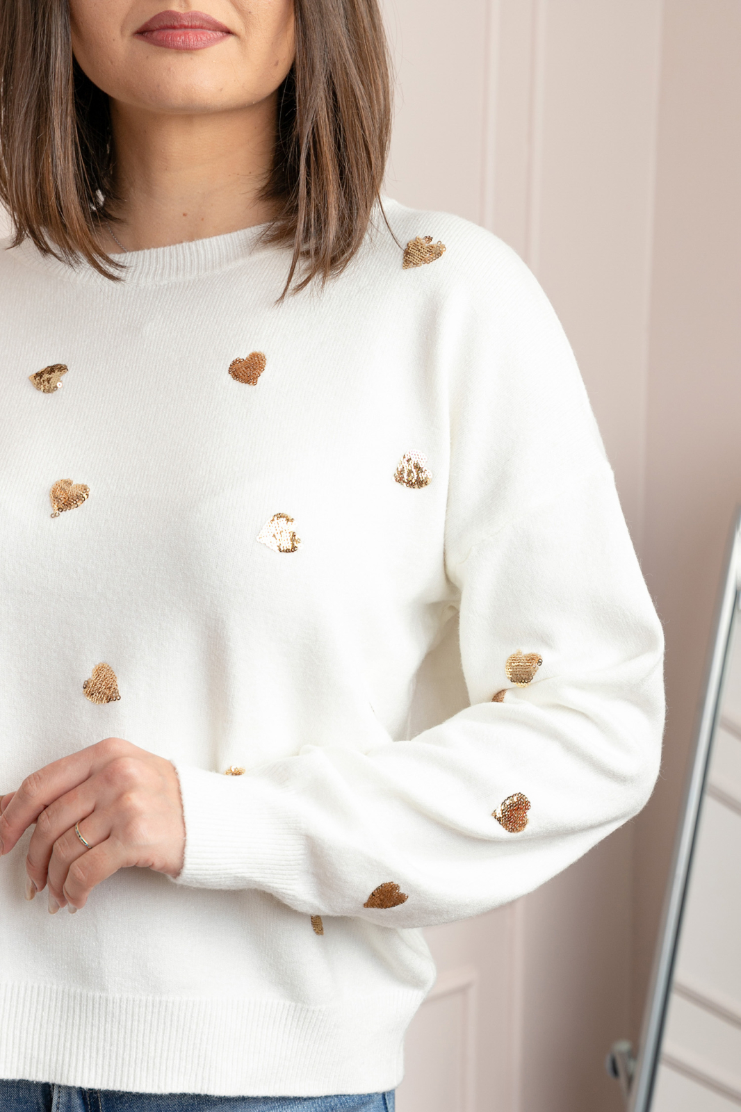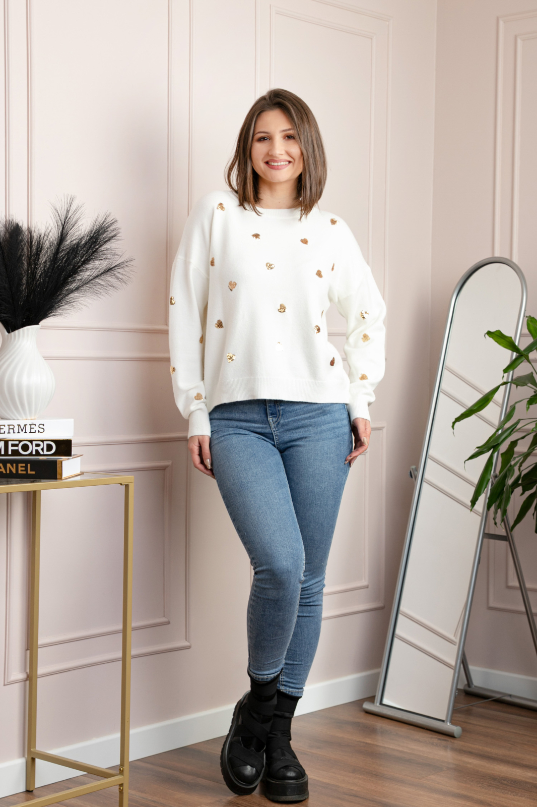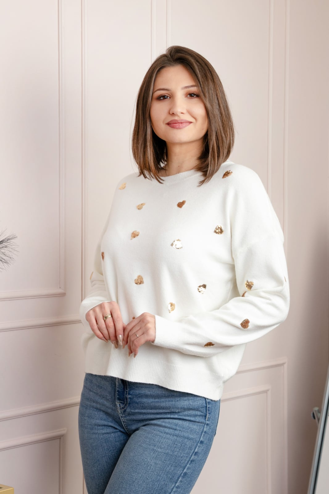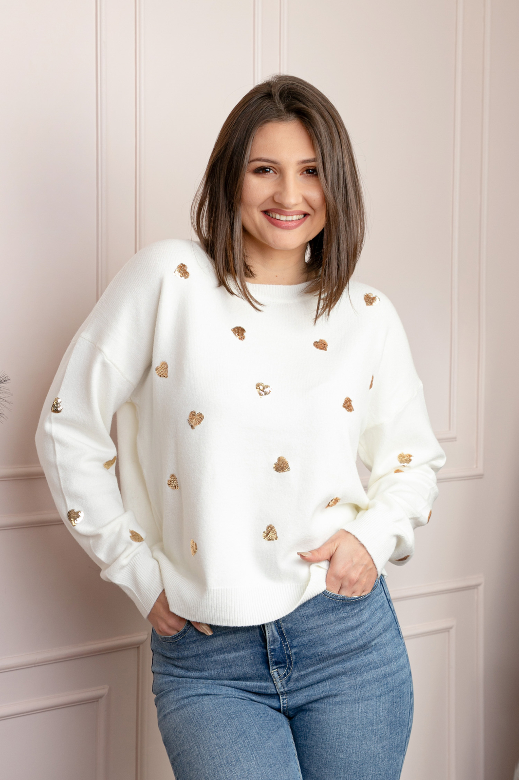 Designul este pus in valoare de inimioarele aurii din paiete aplicate discret, care adauga o nota subtila de stralucire. Croiul lejer si finisajele elastice la maneci si tiv il fac usor de purtat si de integrat in tinute casual sau smart-casual.