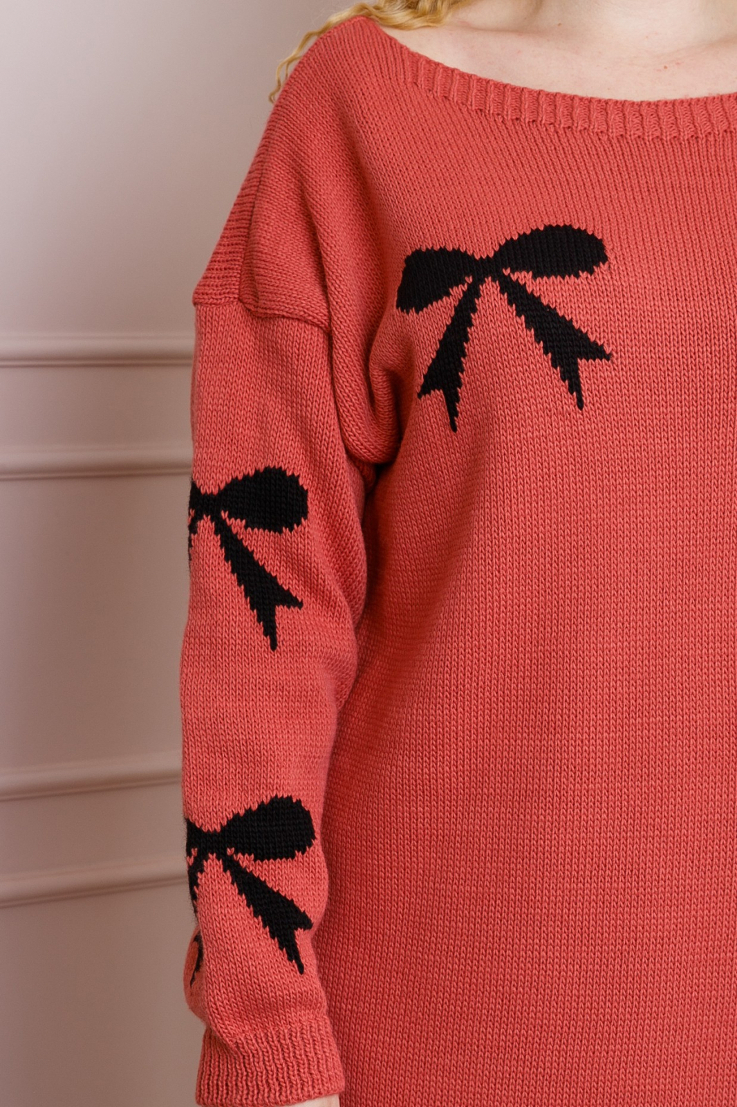 Pulover corai tip rochie, decorat cu fundite negre, ideal pentru un look casual si feminin in sezonul rece. Acest pulover tip rochie ofera un plus de confort si caldura, fiind fabricat dintr-un material moale si placut la atingere. Croiul lejer si detaliile decorative cu fundite adauga un aer jucaus si original tinutei tale. Poate fi purtat atat cu colanti, cat si cu dresuri, asortat cu cizme sau ghete pentru un outfit chic si modern.