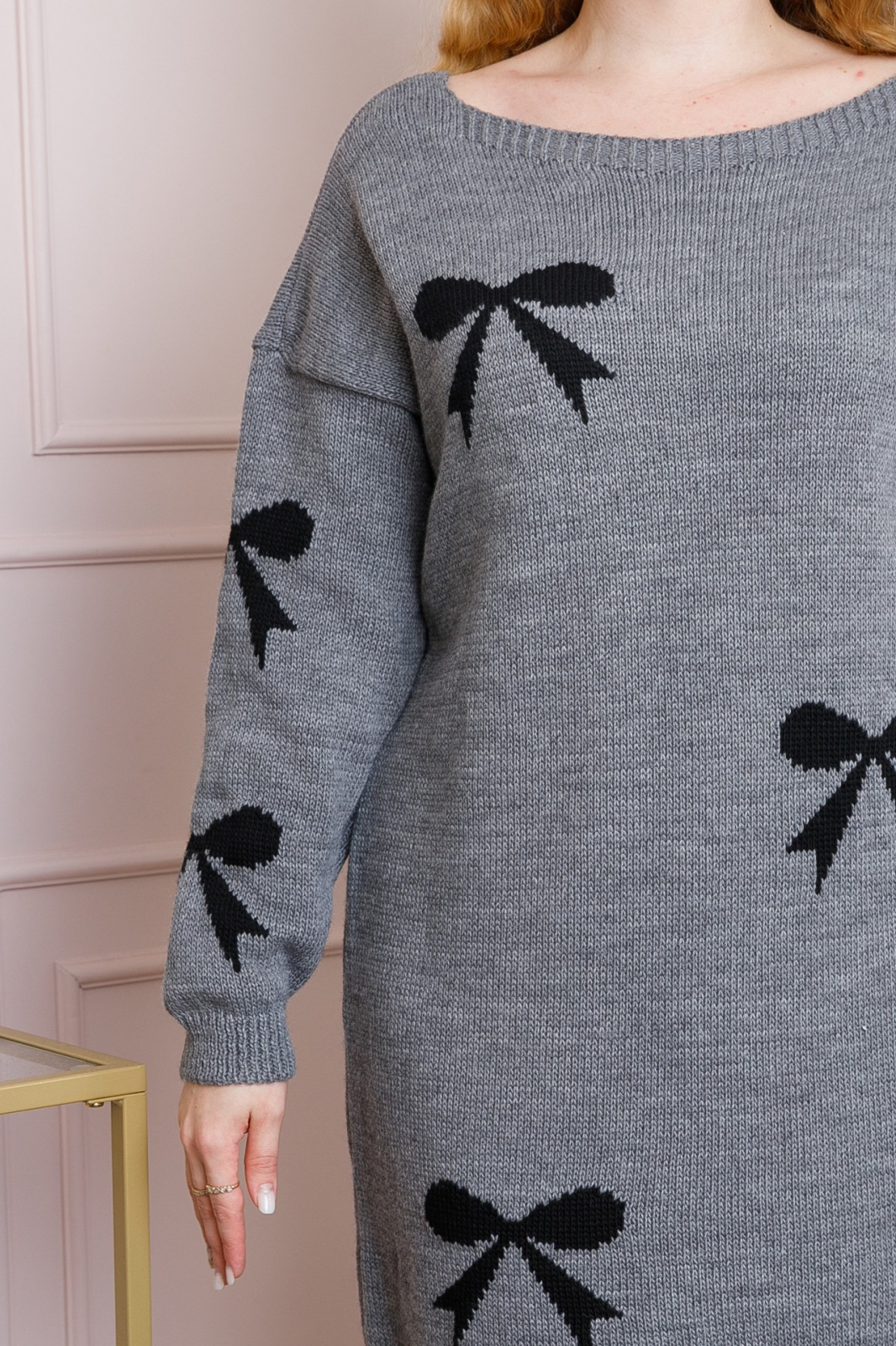 Pulover gri tip rochie, decorat cu fundite negre, ideal pentru un look casual si feminin in sezonul rece. Acest pulover tip rochie ofera un plus de confort si caldura, fiind fabricat dintr-un material moale si placut la atingere. Croiul lejer si detaliile decorative cu fundite adauga un aer jucaus si original tinutei tale. Poate fi purtat atat cu colanti, cat si cu dresuri, asortat cu cizme sau ghete pentru un outfit chic si modern.