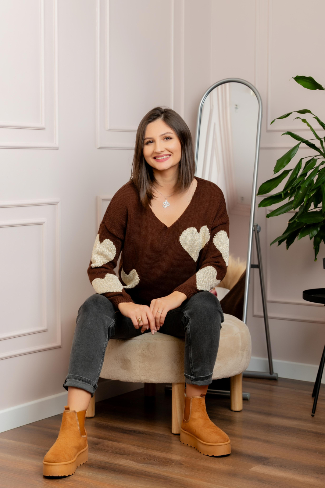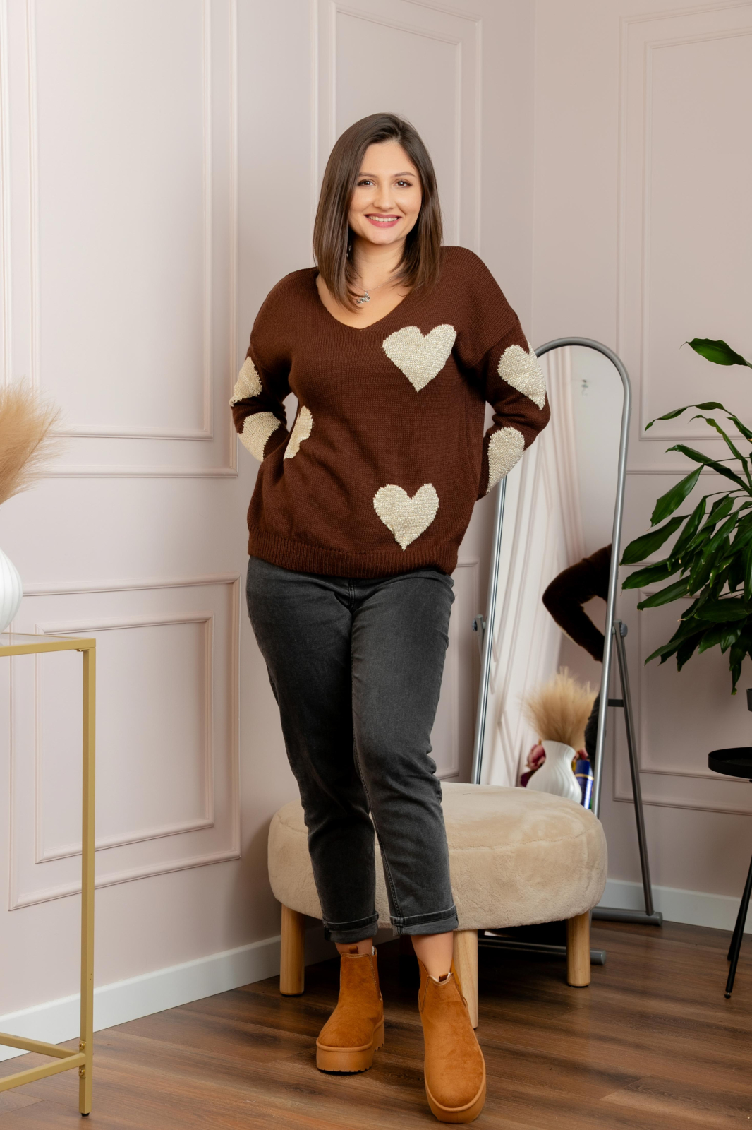 Acest pulover casual este alegerea perfecta pentru zilele racoroase, aducand un plus de confort si stil garderobei tale. Realizat dintr-un material tricotat de inalta calitate, acest pulover negru impresioneaza prin detaliile delicate cu inimioare, perfecte pentru a adauga o nota de feminitate si eleganta tinutei tale.