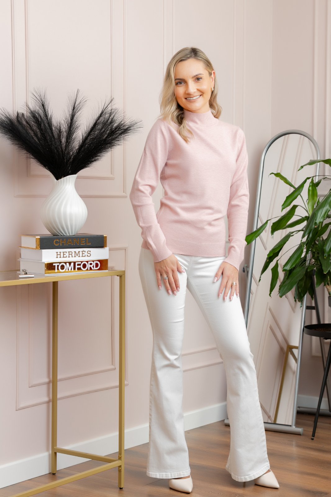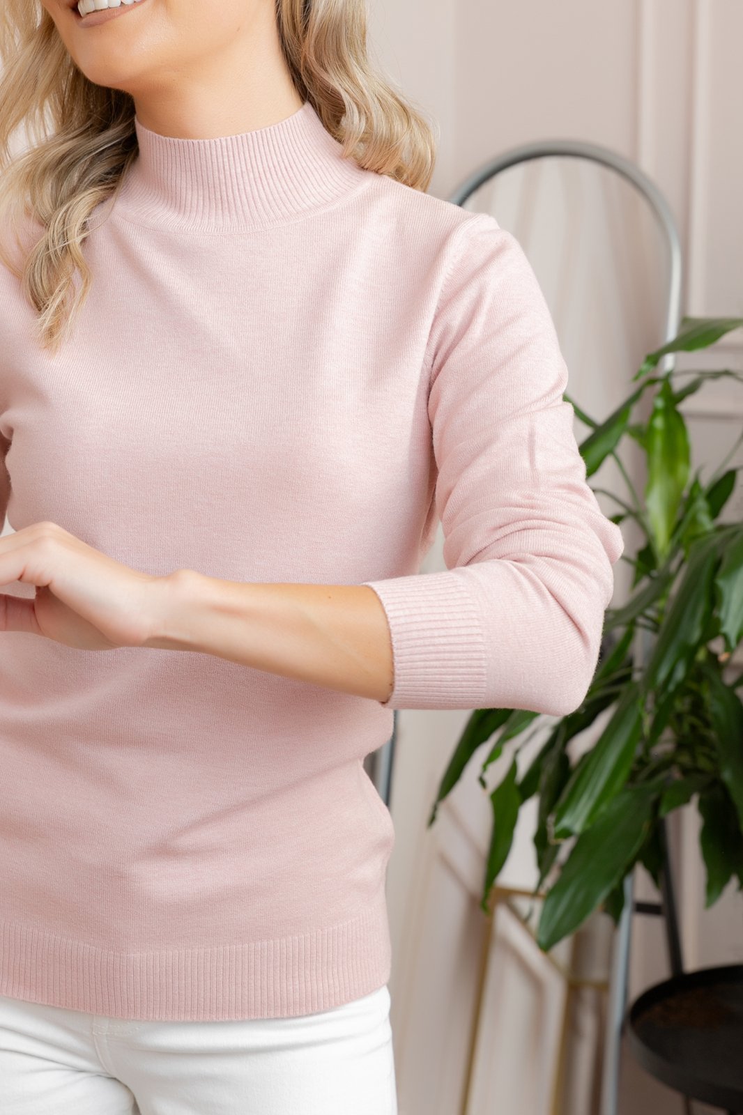 Pulover roz din tricot subtire, moale la atingere, cu guler inalt, ideal pentru tinute elegante sau casual.