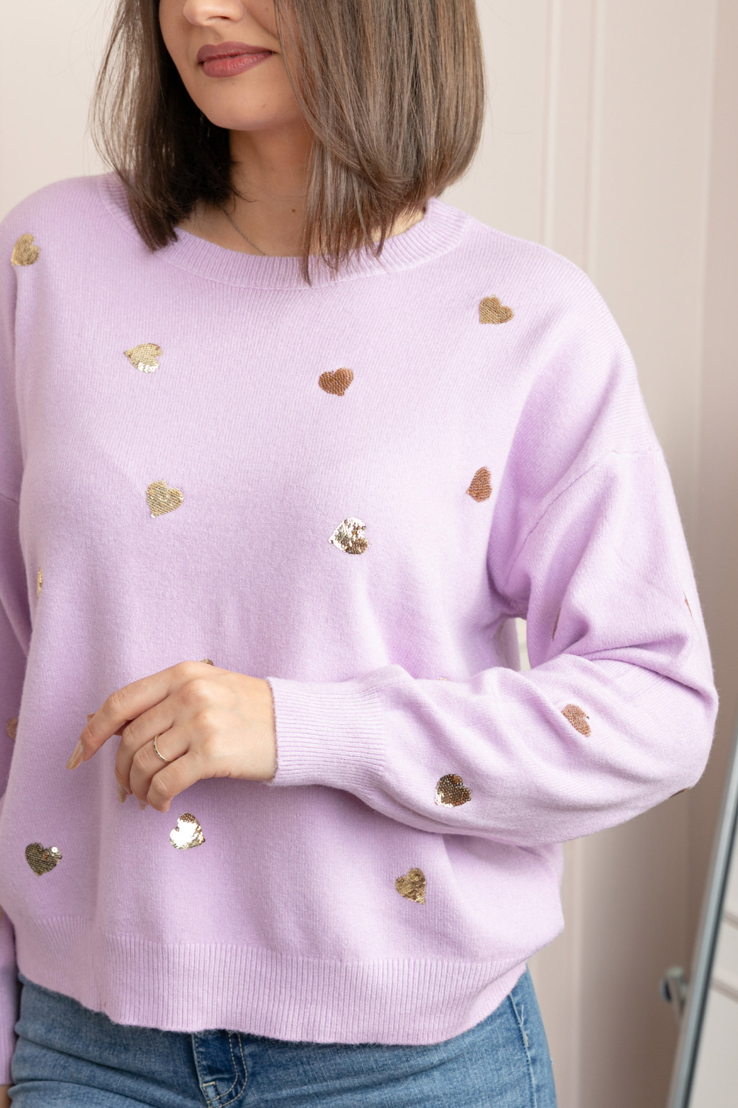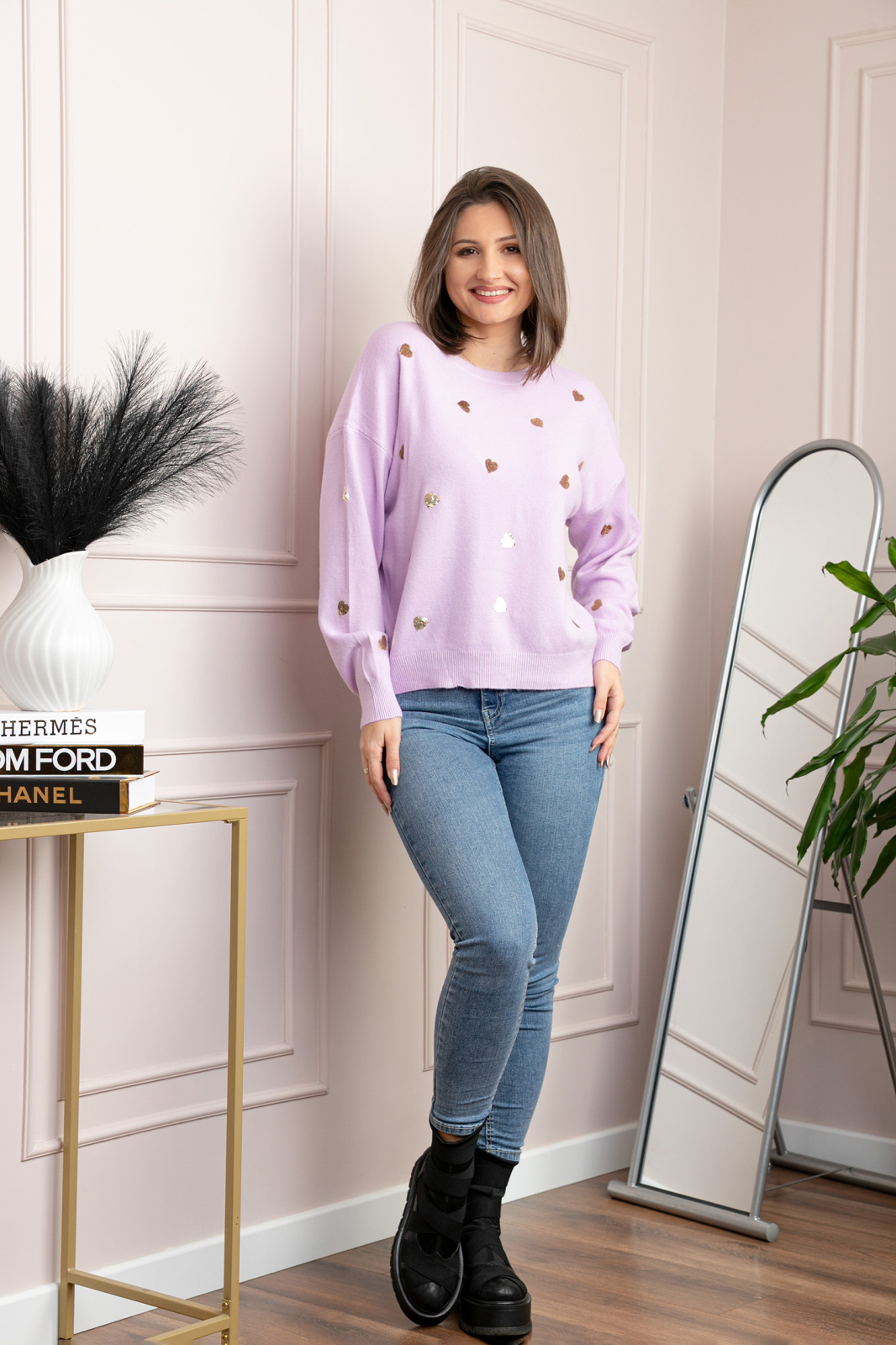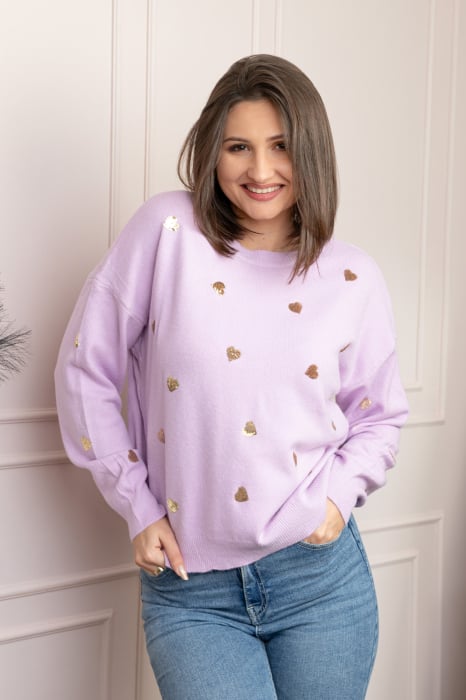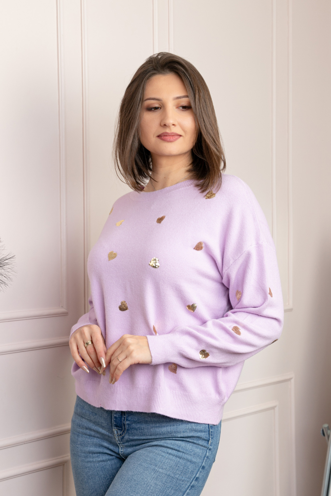 Pulover realizat dintr-un mix fin de vascoza, casmir, spandex si lana, placut la atingere. Cu inimioare aurii din paiete discrete si croi lejer, adauga un aer cald si modern tinutelor tale.