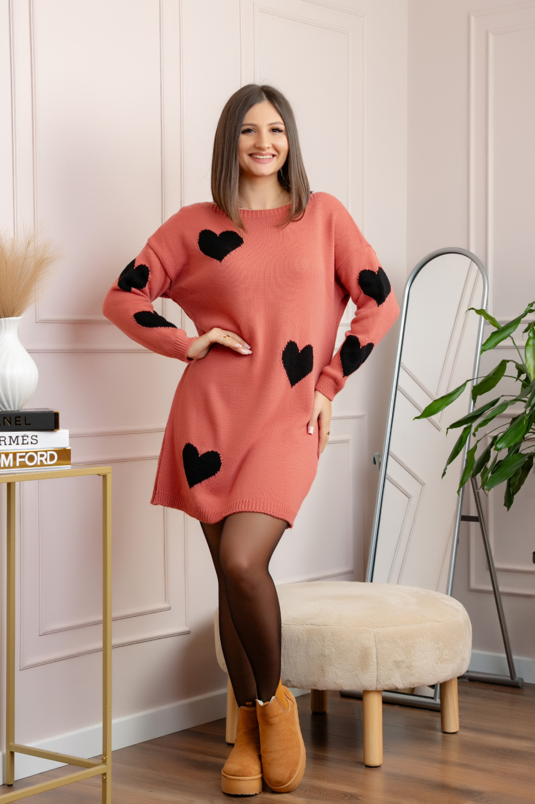 Are umeri cazuti, decolteu barcuta si maneci lungi. Croiul este drept, iar pe partea din fata are inimioare tricotate.