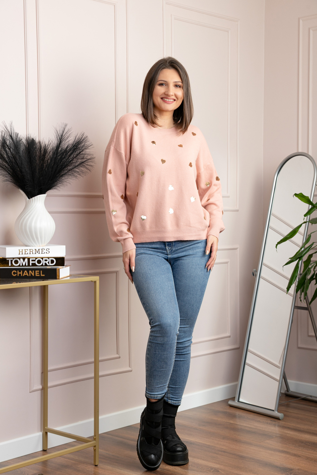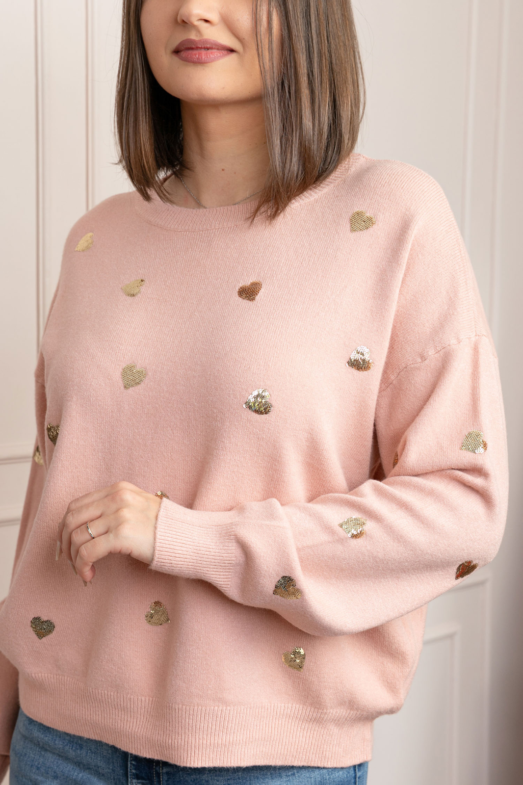 Pulover roz pudrat Riley cu inimioare din paiete aurii