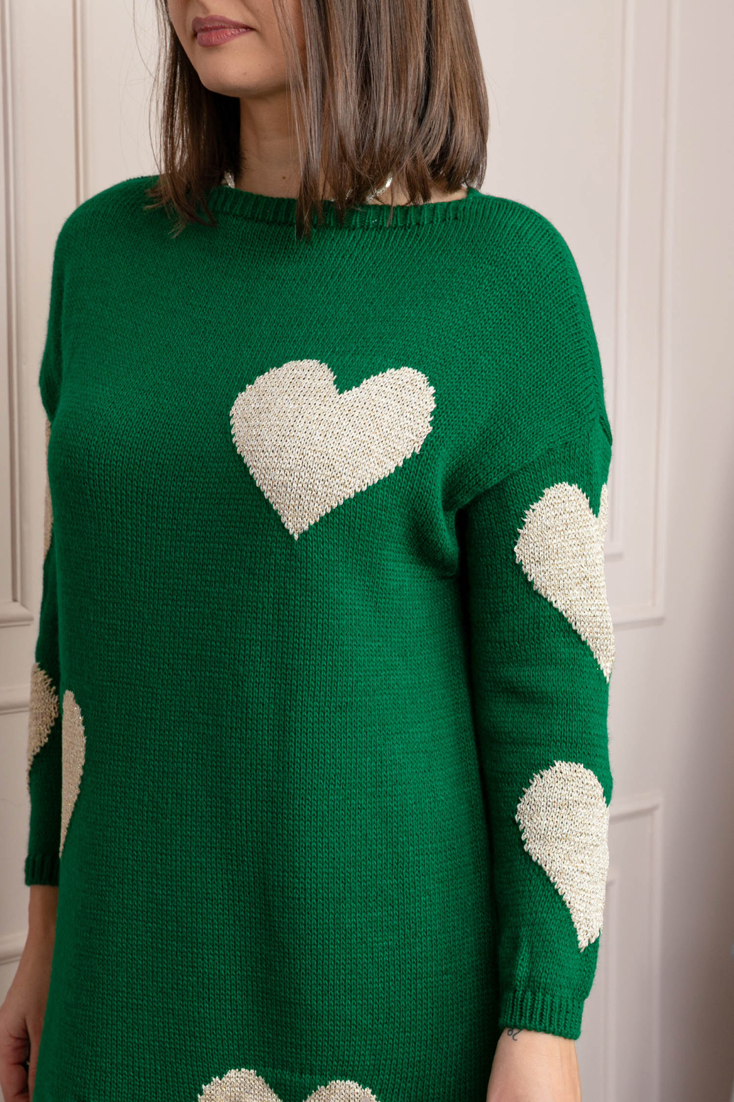 Puloverul Taylor este piesa perfecta pentru zilele reci, combinand confortul unui tricot gros cu un design jucaus si feminin. Realizat dintr-un amestec calduros de fibre (90% acrilic, 10% lurex), acest model are o textura moale si placuta la atingere, oferind totodata straluciri discrete datorita inimioarelor din fir auriu.