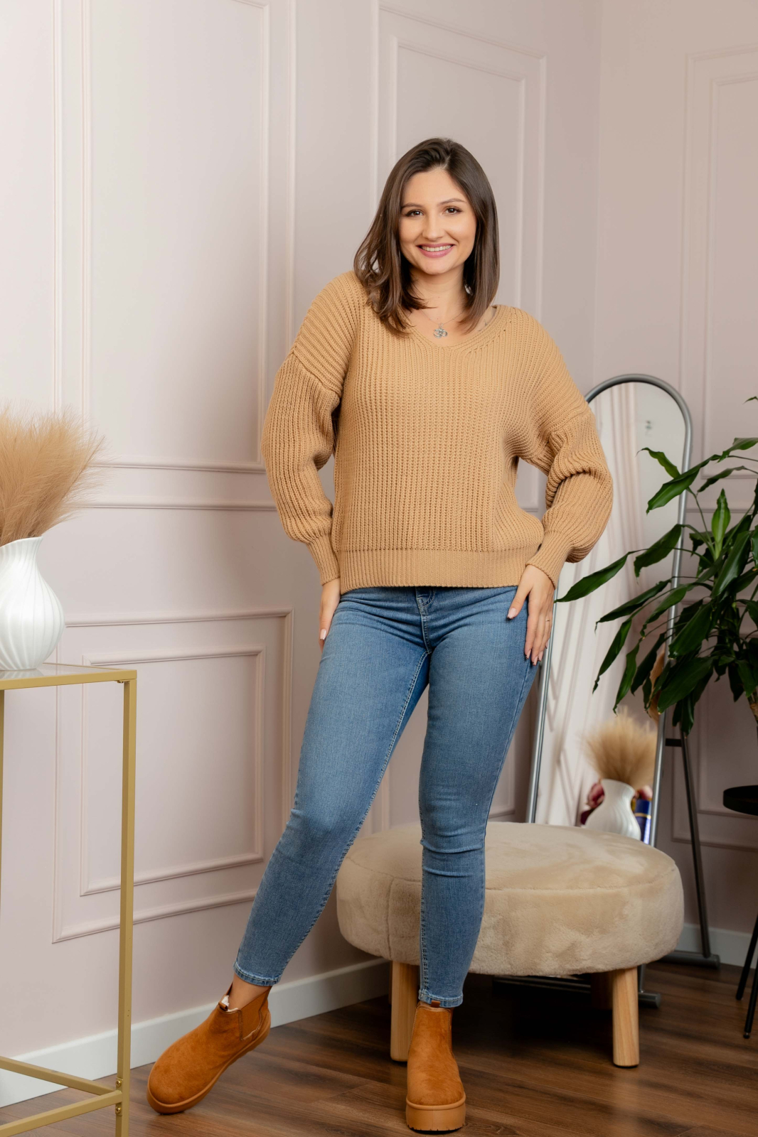 Puloverul Amy imbina confortul termic cu un design modern si minimalist. Confectionat din tricot gros, moale si placut la atingere, are o croiala lejera care ofera libertate de miscare si un aspect relaxat. Decolteul in V adauga o nota feminina, iar culoarea se potriveste perfect cu jeans, fuste sau pantaloni casual.