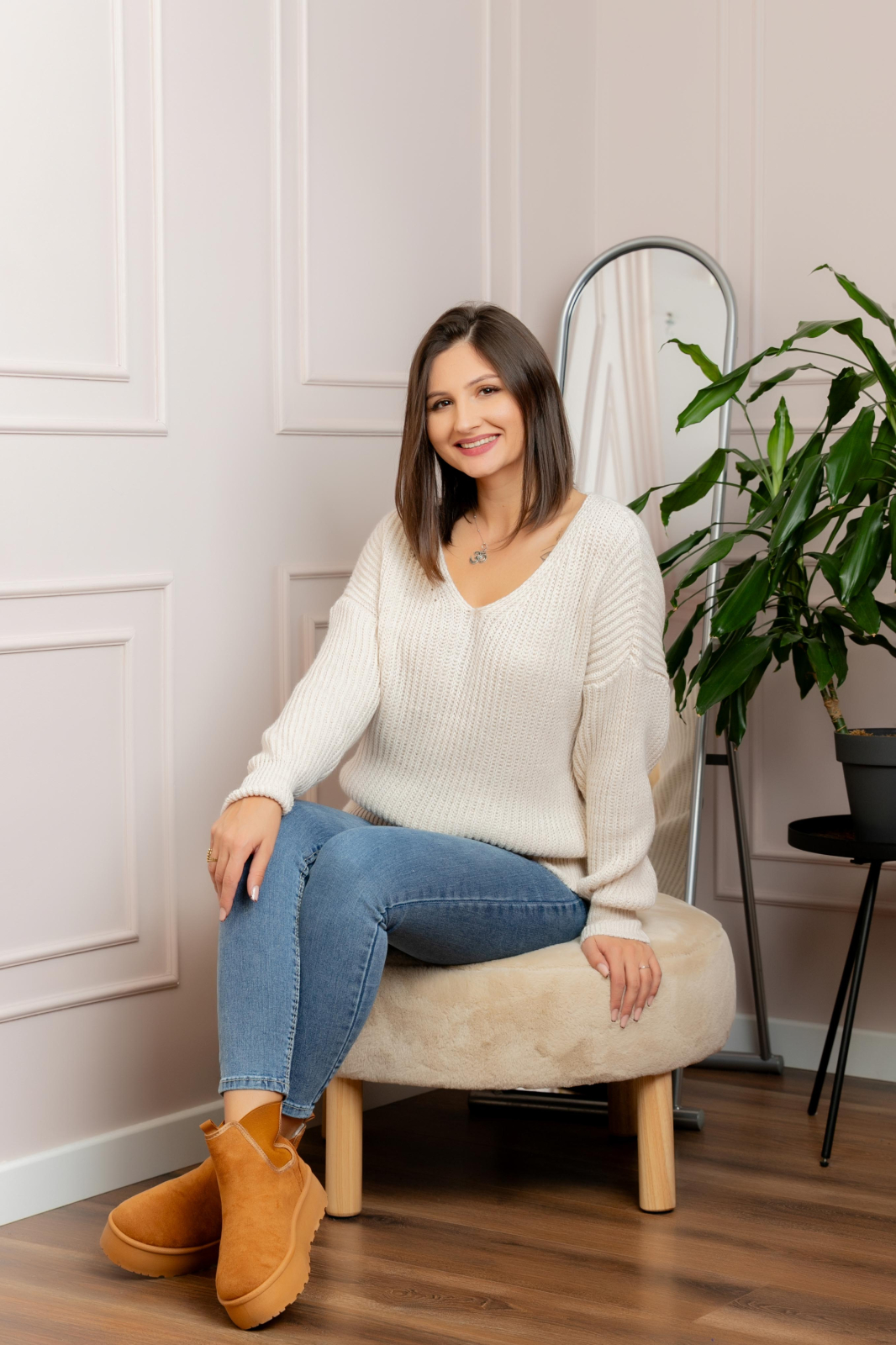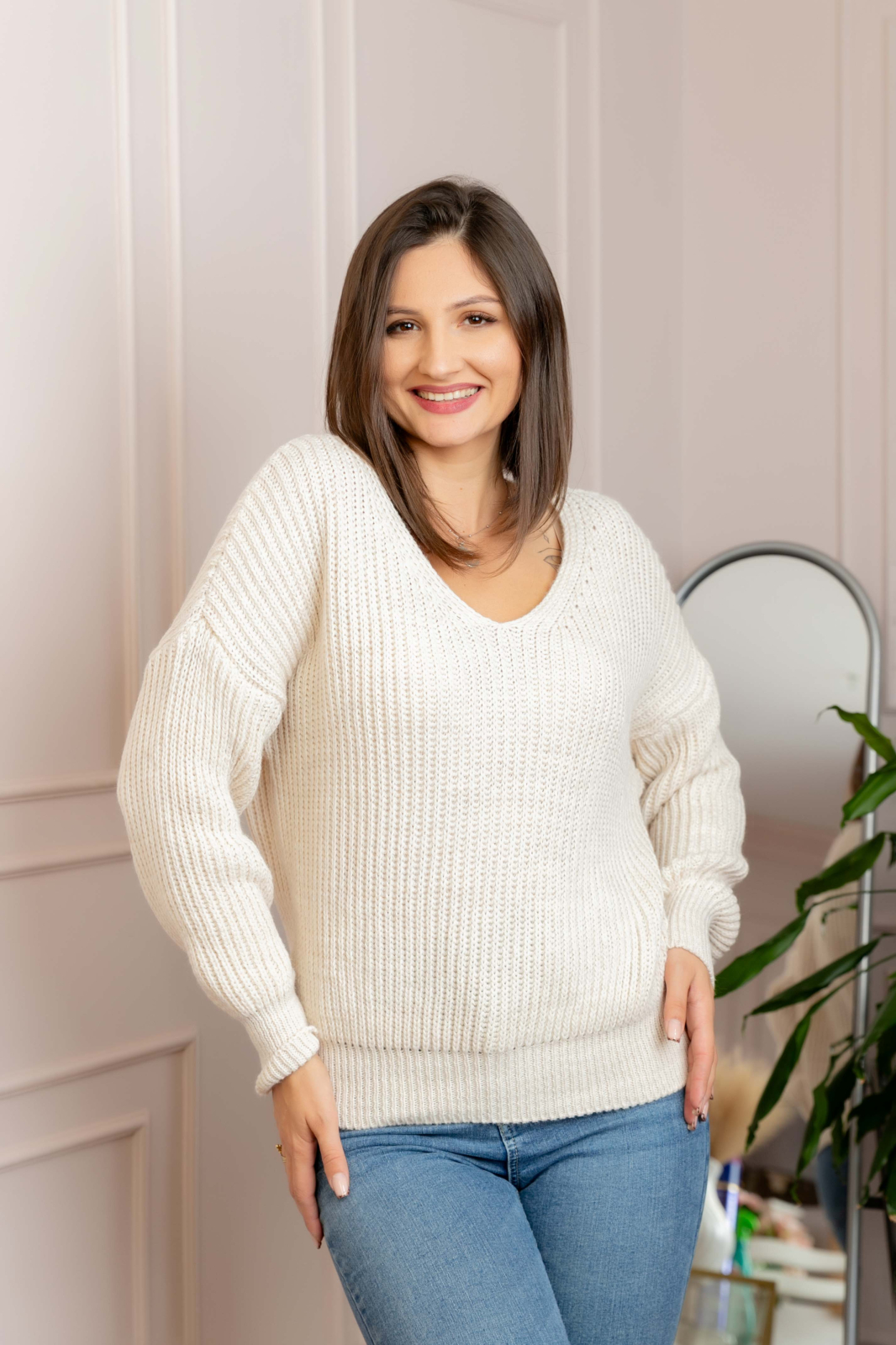 Puloverul Amy imbina confortul termic cu un design modern si minimalist. Confectionat din tricot gros, moale si placut la atingere, are o croiala lejera care ofera libertate de miscare si un aspect relaxat. Decolteul in V adauga o nota feminina, iar culoarea se potriveste perfect cu jeans, fuste sau pantaloni casual.