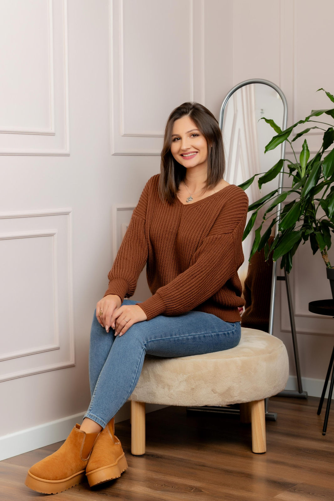 Puloverul Amy imbina confortul termic cu un design modern si minimalist. Confectionat din tricot gros, moale si placut la atingere, are o croiala lejera care ofera libertate de miscare si un aspect relaxat. Decolteul in V adauga o nota feminina, iar culoarea se potriveste perfect cu jeans, fuste sau pantaloni casual.