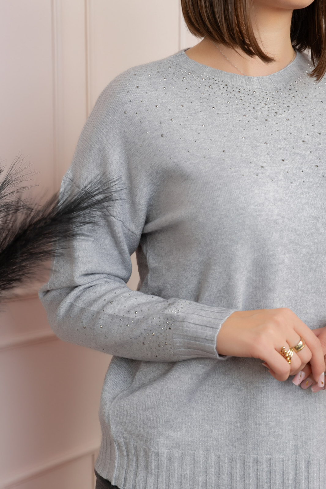 Puloverul Elizabeth adauga o nota sofisticata oricarei tinute prin detaliile sale subtile cu strasuri, aplicate delicat pe decolteu si maneci. Materialul moale, placut la atingere, combina perfect confortul bumbacului cu rafinamentul casmirului si elasticitatea data de elastan. Croiul lejer si tivul fin lucrat il fac ideal atat pentru tinutele de zi, cat si pentru serile casual-elegante.