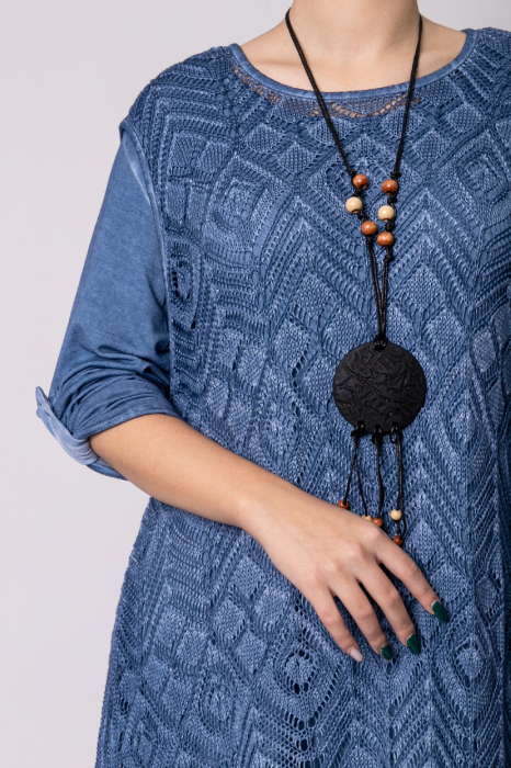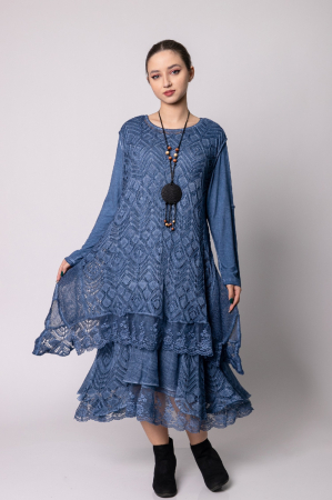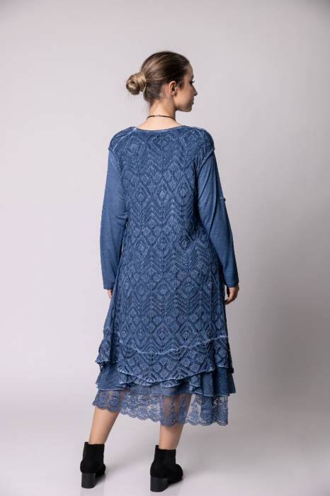 Rochie boema cu maneci lungi, decolteu rotund si baza asimetrica cu volane. Rochia este accesorizata cu un colier decorativ si este compusa din doua piese: o rochie subtire pe interior si o rochie tricotata fara maneci la exterior. Manecile pot fi rulate pana la o lungime de ¾ si fixate cu nasture. Tipul de croi in A se potriveste tuturor siluetelor, favorizand mai ales silueta tip triunghi inversat si silueta tip para.