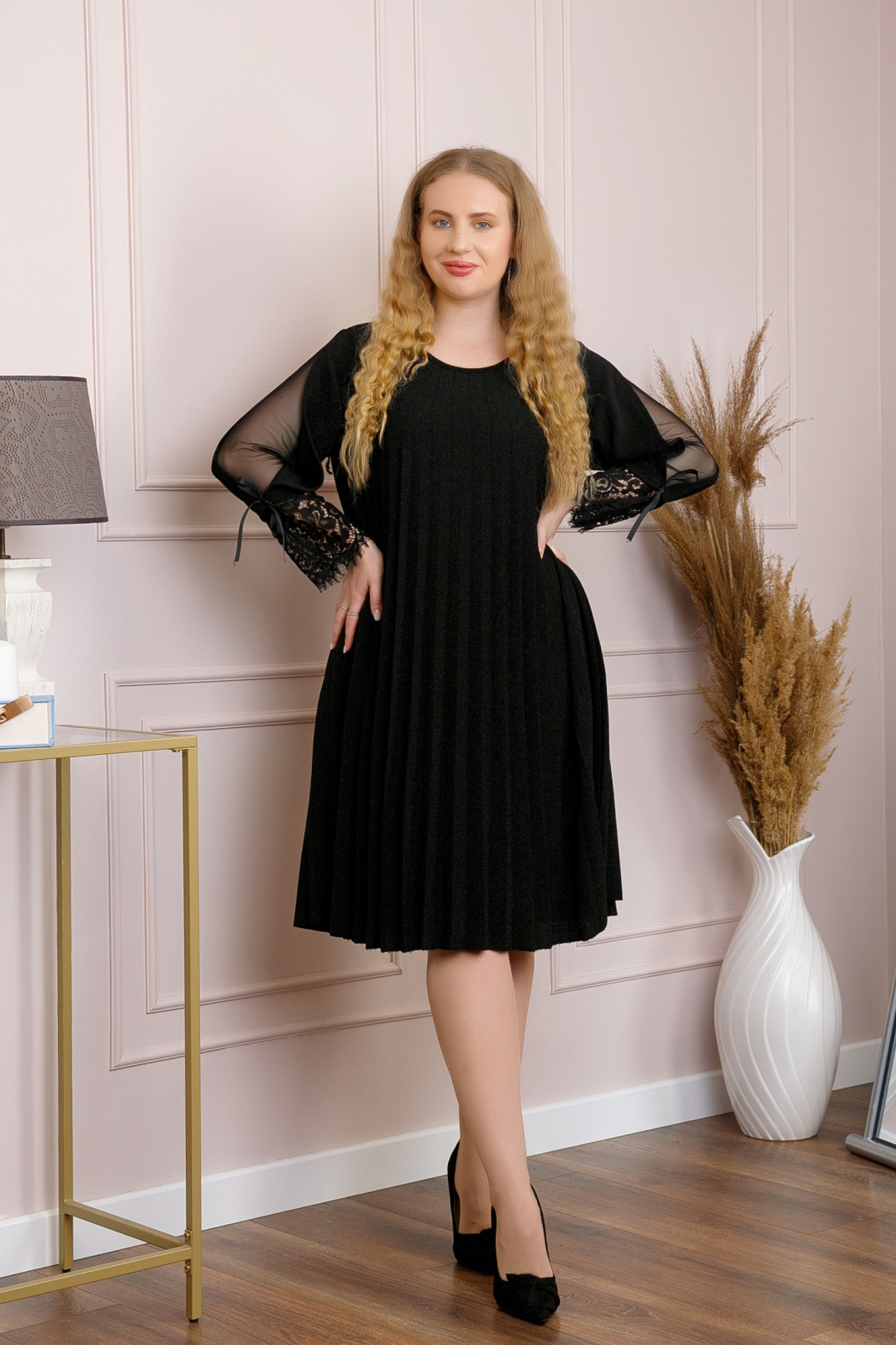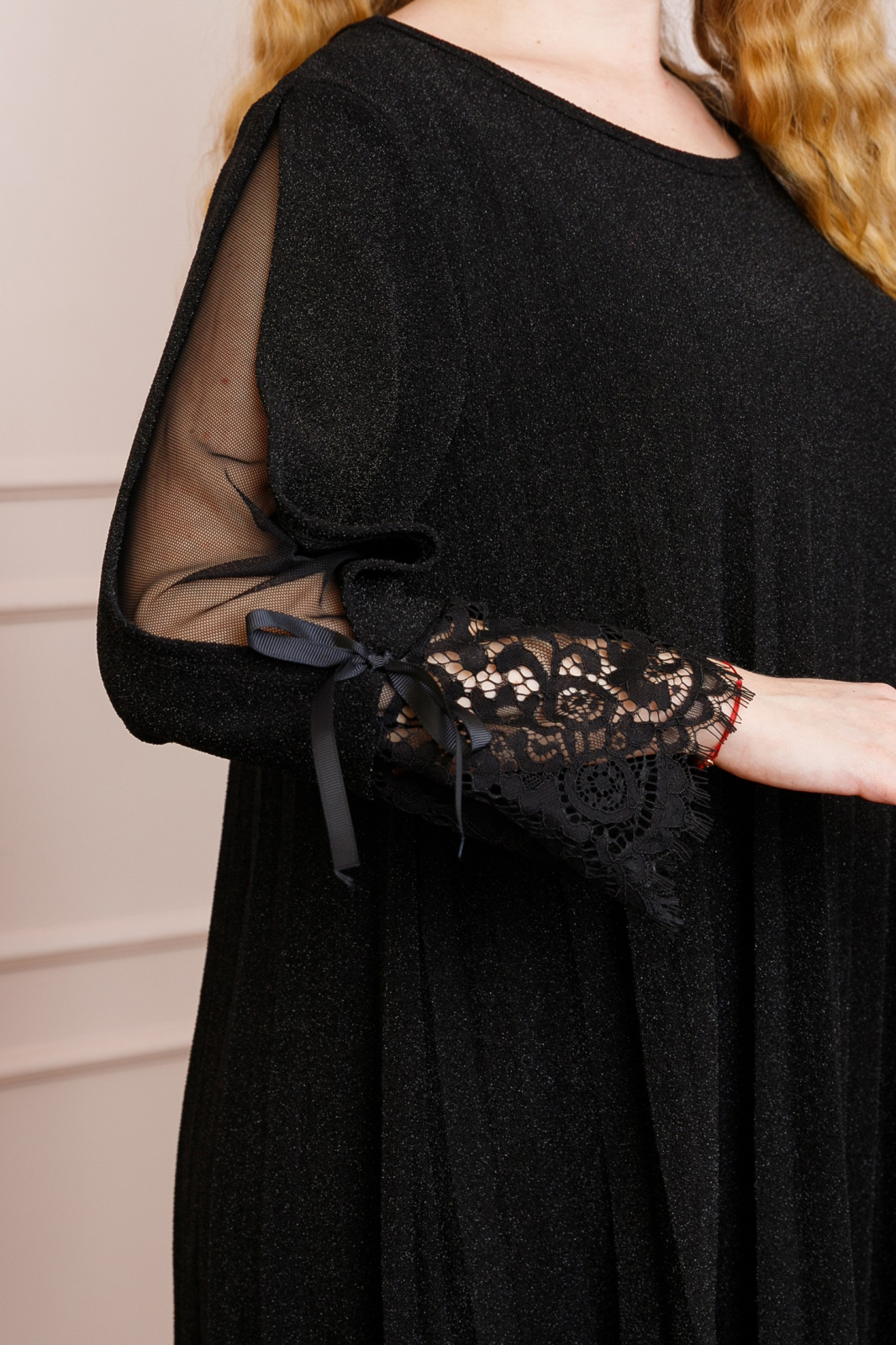 Rochie plisata neagra, cu maneci decorate cu plasa, dantela si fundite, ideala pentru un look elegant si rafinat. Aceasta rochie midi imbina stilul clasic cu detalii moderne, fiind potrivita pentru evenimente speciale sau iesiri elegante. Materialul este confortabil si placut la atingere, iar designul plisat adauga fluiditate si miscare tinutei. Manecile cu dantela si fundite adauga o nota feminina si delicata, facand din aceasta rochie o piesa de rezistenta in garderoba de toamna-iarna.