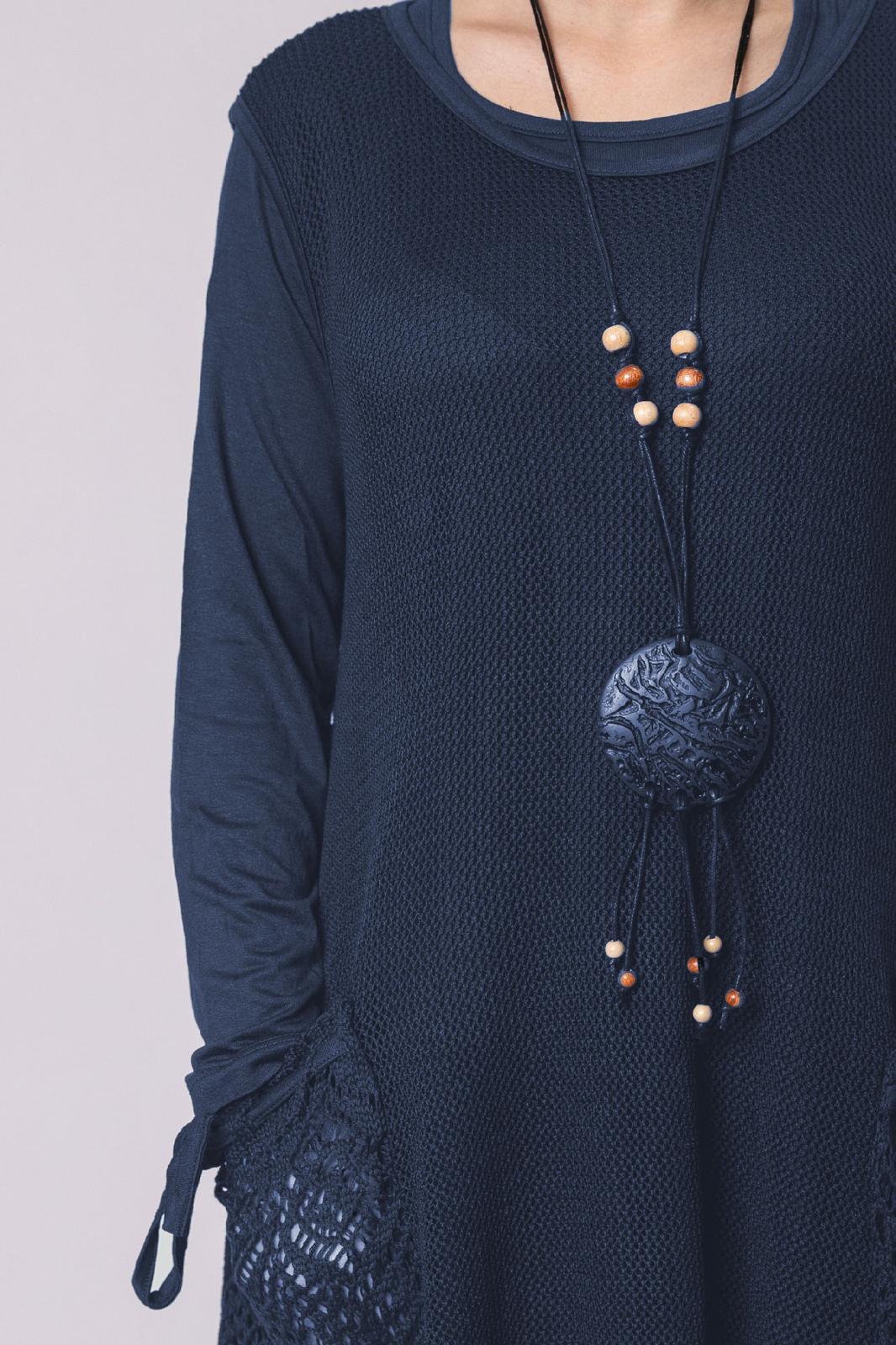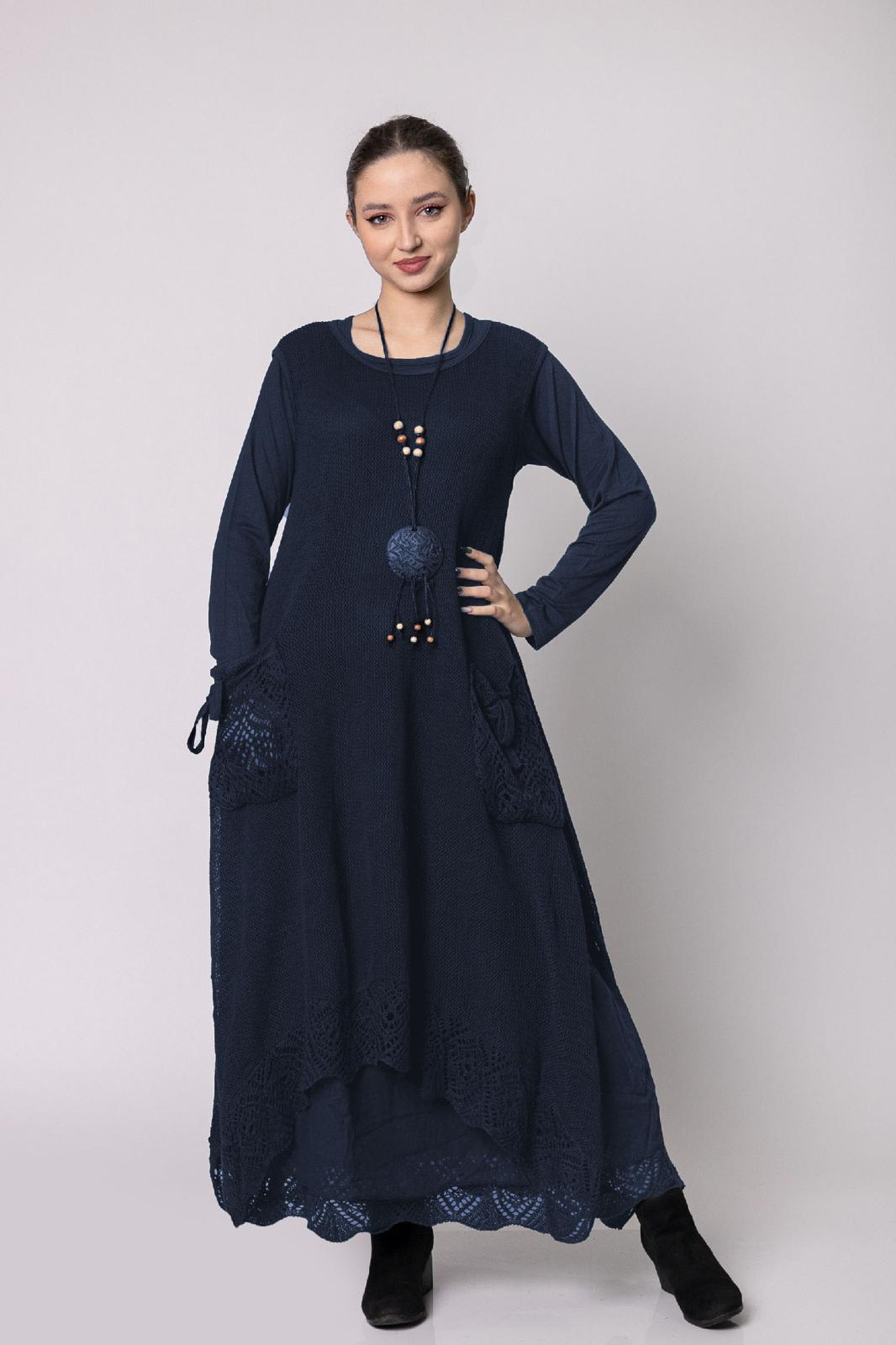 Rochie boema cu maneci lungi, decolteu rotund si baza asimetrica in colturi. Rochia este accesorizata cu buzunare din tricot crosetat si un colier decorativ si este compusa din doua piese: o rochie subtire pe interior si o rochie tricotata fara maneci la exterior. Tipul de croi in A se potriveste tuturor siluetelor, favorizand mai ales silueta tip triunghi inversat si silueta tip para.