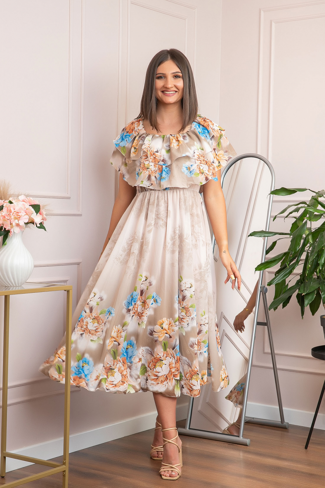 Rochie de ocazie Elle cu volane ample si imprimeuri florale - Crem
