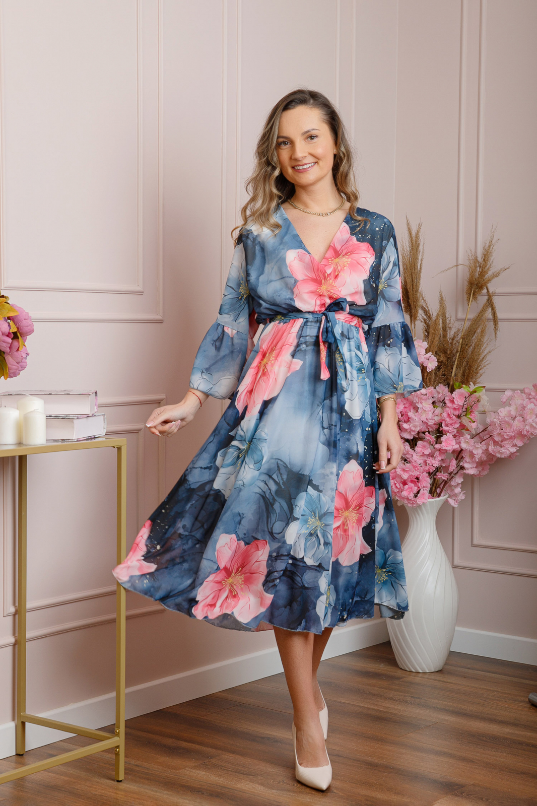 Rochie eleganta Adaline din voal bleumarin cu imprimeuri florale