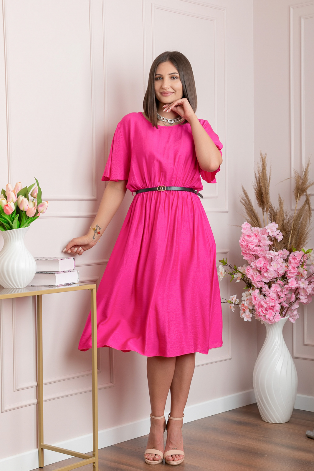 Rochia midi Leona impresioneaza prin nuanta vibranta de ciclam si prin croiala A‑line fluida, care urmeaza lejer linia corpului fara sa adauge volum nedorit. Elasticul discret integrat in talie defineste delicat silueta, iar cureaua subtire reglabila cu inchidere metalica iti permite sa ajustezi rochia exact pe masura ta si sa accentuezi talia atat cat doresti. Manecile scurte tip fluture ofera un plus de feminitate si libertate de miscare, iar decolteul rotund aduce echilibru tinutei, facand‑o potrivita atat pentru birou, cat si pentru iesiri relaxate sau evenimente de zi. Materialul este opac, nu necesita dublura la interior si ramane placut pe piele chiar si in zilele calde, multumita texturii usoare si respirabile. Lungimea midi, care cade elegant, confera versatilitate rochiei, astfel incat o poti purta cu sandale delicate, dar si cu pantofi cu toc, pentru un look casual‑elegant de primavara‑vara care atrage toate privirile.