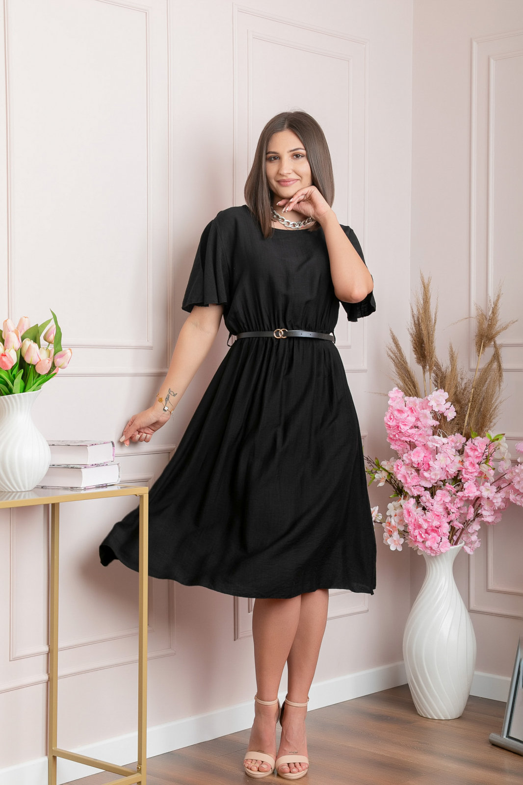 Rochia midi Leona impresioneaza prin nuanta eleganta de negru si prin croiala A‑line fluida, care urmeaza lejer linia corpului fara sa adauge volum nedorit. Elasticul discret integrat in talie defineste delicat silueta, iar cureaua subtire reglabila cu inchidere metalica iti permite sa ajustezi rochia exact pe masura ta si sa accentuezi talia atat cat doresti. Manecile scurte tip fluture ofera un plus de feminitate si libertate de miscare, iar decolteul rotund aduce echilibru tinutei, facand‑o potrivita atat pentru birou, cat si pentru iesiri relaxate sau evenimente de zi. Materialul este opac, nu necesita dublura la interior si ramane placut pe piele chiar si in zilele calde, multumita texturii usoare si respirabile. Lungimea midi, care cade elegant, confera versatilitate rochiei, astfel incat o poti purta cu sandale delicate, dar si cu pantofi cu toc, pentru un look casual‑elegant de primavara‑vara care atrage toate privirile.