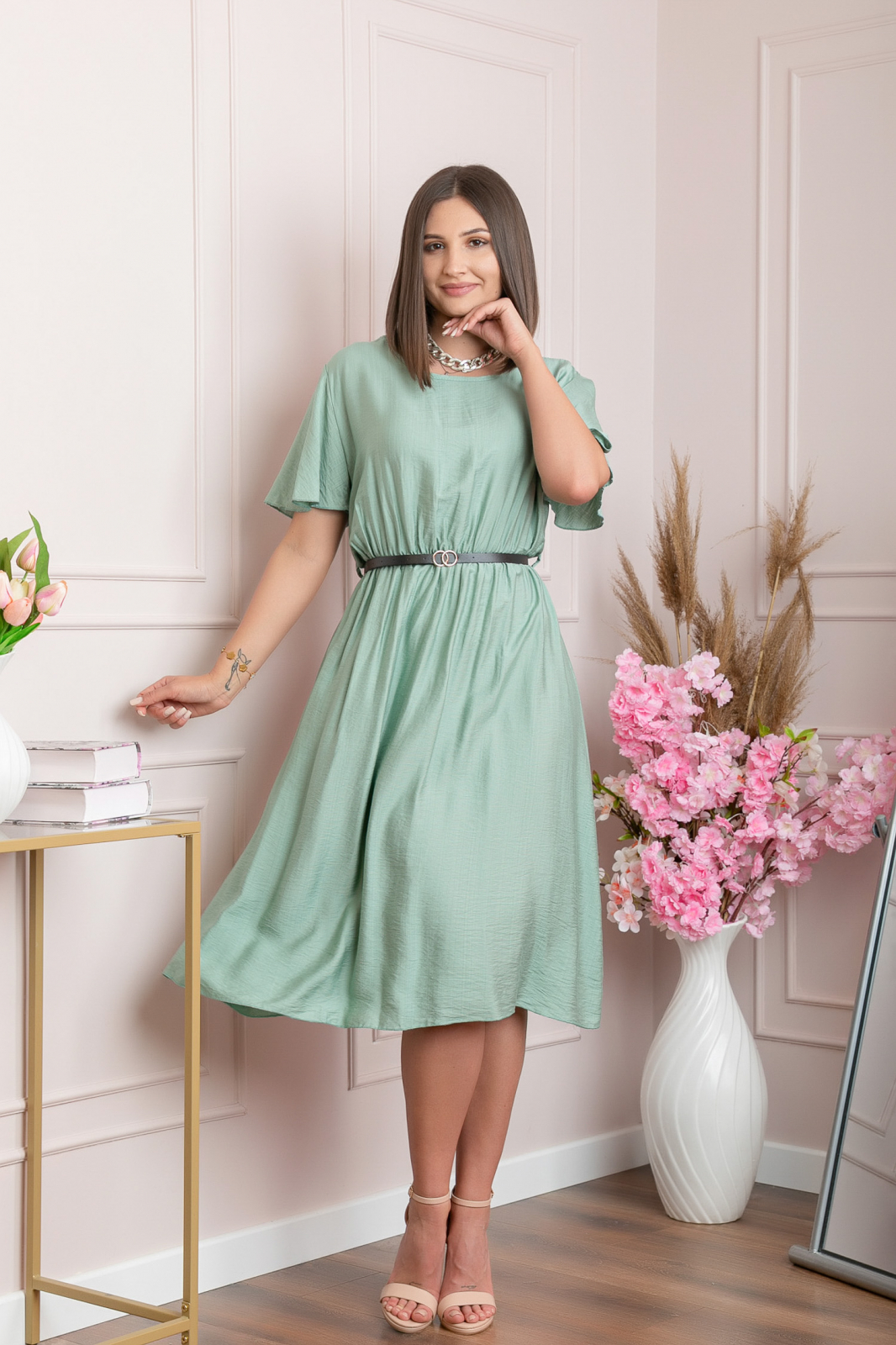 Rochia midi Leona impresioneaza prin nuanta fresh de verde mint si prin croiala A‑line fluida, care urmeaza lejer linia corpului fara sa adauge volum nedorit. Elasticul discret integrat in talie defineste delicat silueta, iar cureaua subtire reglabila cu inchidere metalica iti permite sa ajustezi rochia exact pe masura ta si sa accentuezi talia atat cat doresti. Manecile scurte tip fluture ofera un plus de feminitate si libertate de miscare, iar decolteul rotund aduce echilibru tinutei, facand‑o potrivita atat pentru birou, cat si pentru iesiri relaxate sau evenimente de zi. Materialul este opac, nu necesita dublura la interior si ramane placut pe piele chiar si in zilele calde, multumita texturii usoare si respirabile. Lungimea midi, care cade elegant, confera versatilitate rochiei, astfel incat o poti purta cu sandale delicate, dar si cu pantofi cu toc, pentru un look casual‑elegant de primavara‑vara care atrage toate privirile.