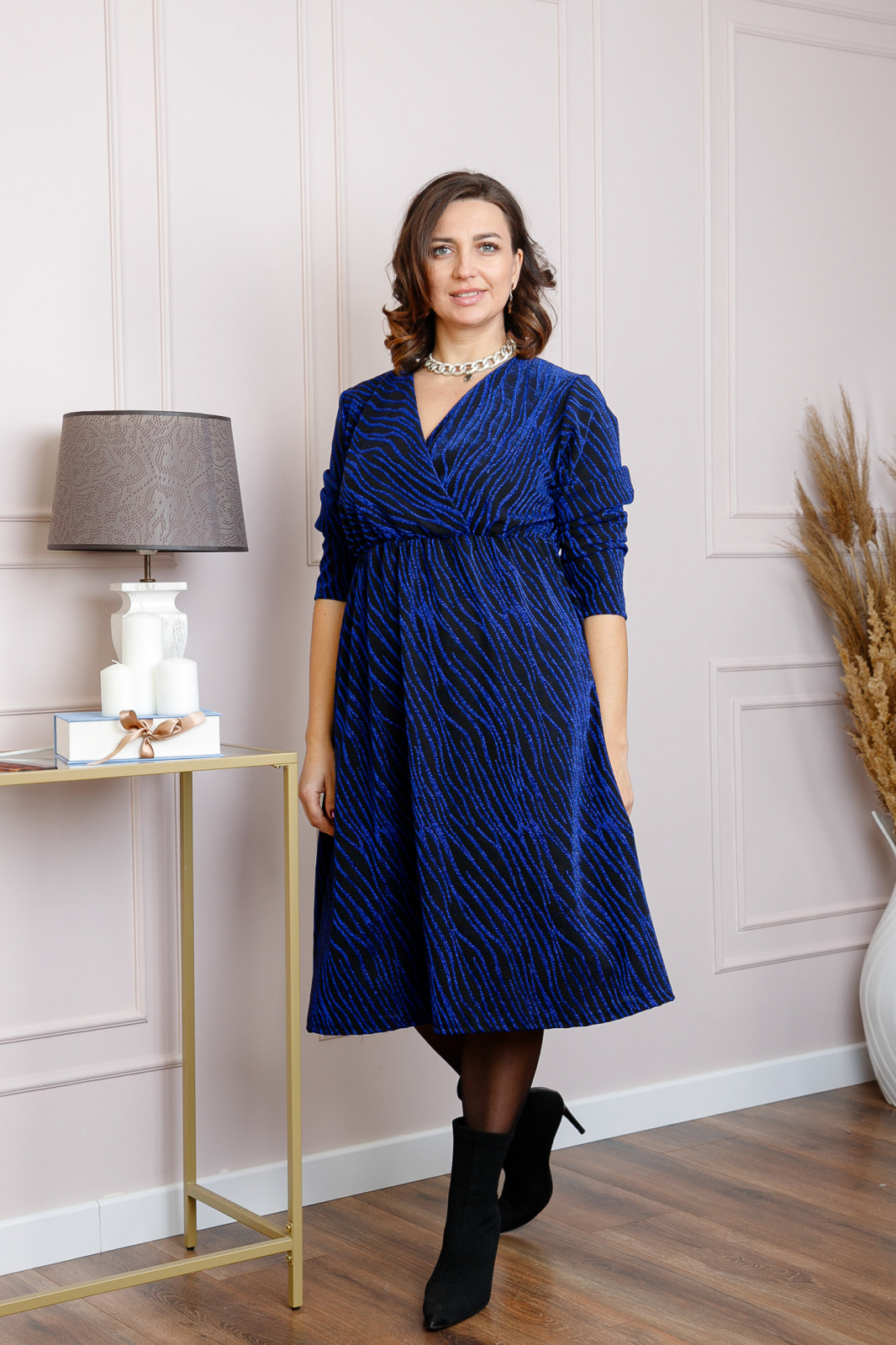 Acest model de rochie eleganta este alegerea perfecta pentru femeile care doresc sa impresioneze prin rafinament si stil. Realizata dintr-un material confortabil, aceasta rochie midi ofera o croiala tip petrecut la bust, care avantajeaza orice silueta. Imprimeul modern, cu accente albastre si negre, adauga un aer sofisticat, perfect pentru evenimente speciale sau intalniri formale. Rochia are cu maneci trei sferturi, ideale pentru anotimpurile mai racoroase, iar elasticul discret din talie asigura o potrivire perfecta si un confort sporit pe durata purtarii. Se poate asorta usor cu o pereche de botine elegante si accesorii aurii pentru un look complet. Modelul are 165 cm inaltime.