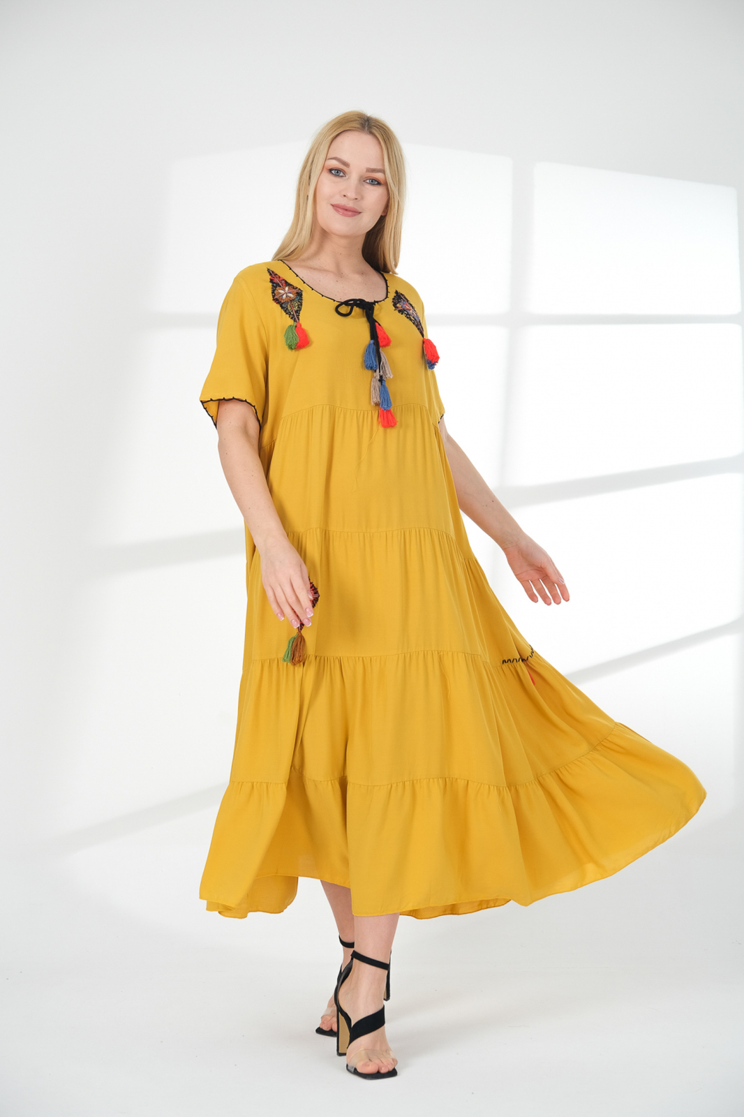 Rochie boema cu maneci scurte si volane, decorata cu romburi din material textil si ciucuri. Modelul de croi in A este lejer si se potriveste tuturor siluetelor, favorizand mai ales silueta tip triunghi inversat si silueta tip para.