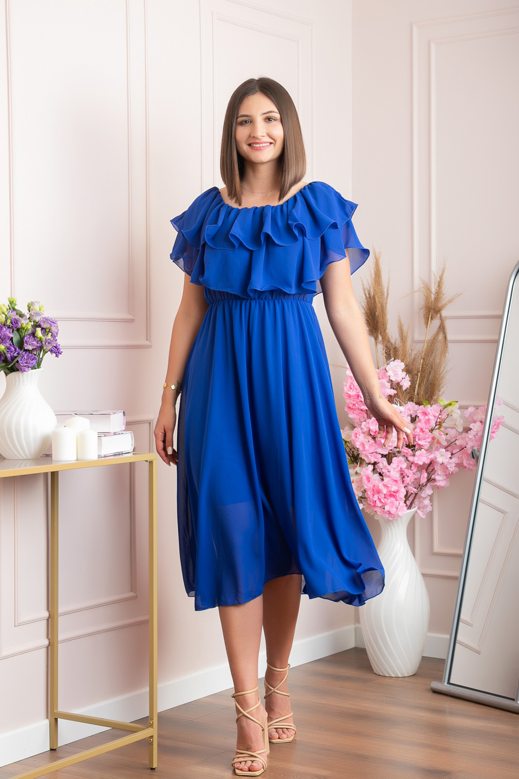 Modelul Joyce este rochia eleganta care imbina fluiditatea voalului cu un design versatil, perfect pentru evenimente de seara, nunti, botezuri sau cocktailuri. Cele doua volane ample de pe bust cad lejer, conturand delicat zona umerilor si permitand purtarea atat pe, cat si sub linia umerilor pentru un look fermecator. Croiul midi in A avantajeaza silueta, iar talia elastica accentueaza in mod confortabil formele, oferind libertate de miscare pe toata durata purtarii. Interiorul este captusit cu o dublura fina, astfel incat rochia sa nu fie transparenta, iar senzatia pe piele sa fie placuta. Nuanta rochiei este pusa in valoare de textura vaporoasa a voalului, creand o prezenta sofisticata si diafana. Acest model de rochie se accesorizeaza usor cu sandale sau pantofi si bijuterii delicate, transformand fiecare aparitie intr-o declaratie de stil.