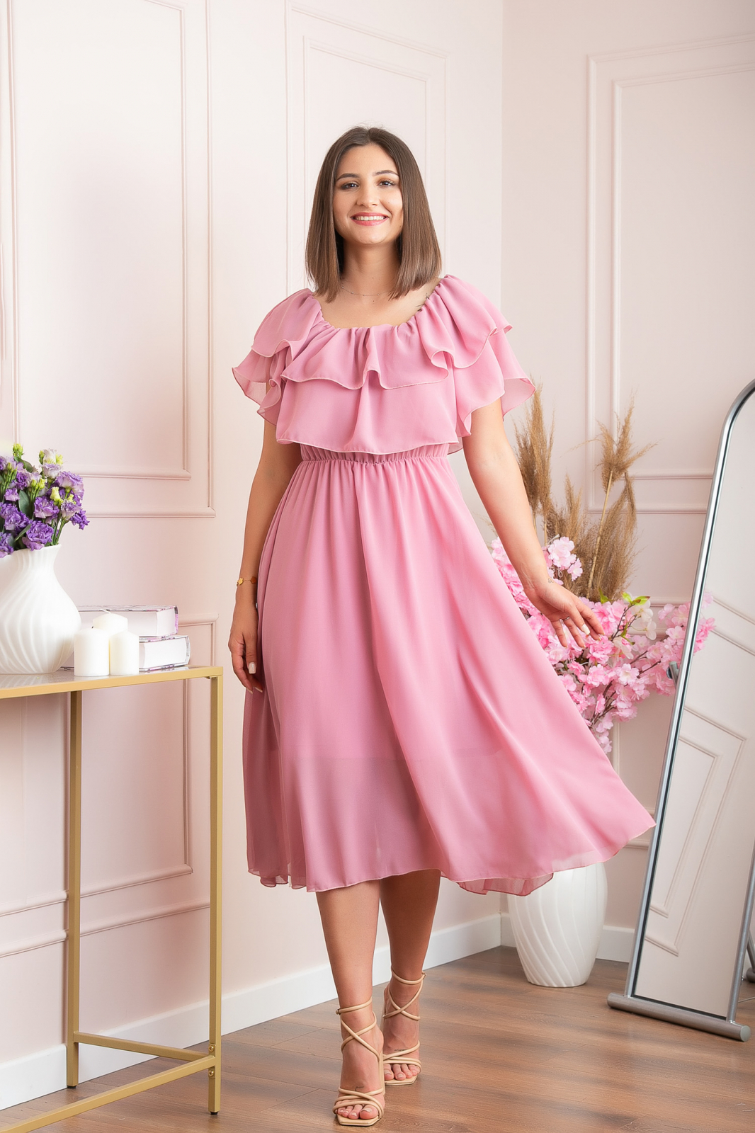 Modelul Joyce este rochia eleganta care imbina fluiditatea voalului cu un design versatil, perfect pentru evenimente de seara, nunti, botezuri sau cocktailuri. Cele doua volane ample de pe bust cad lejer, conturand delicat zona umerilor si permitand purtarea atat pe, cat si sub linia umerilor pentru un look fermecator. Croiul midi in A avantajeaza silueta, iar talia elastica accentueaza in mod confortabil formele, oferind libertate de miscare pe toata durata purtarii. Interiorul este captusit cu o dublura fina, astfel incat rochia sa nu fie transparenta, iar senzatia pe piele sa fie placuta. Nuanta rochiei este pusa in valoare de textura vaporoasa a voalului, creand o prezenta sofisticata si diafana. Acest model de rochie se accesorizeaza usor cu sandale sau pantofi si bijuterii delicate, transformand fiecare aparitie intr-o declaratie de stil.