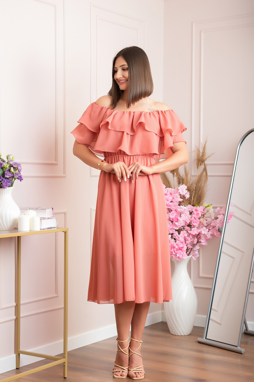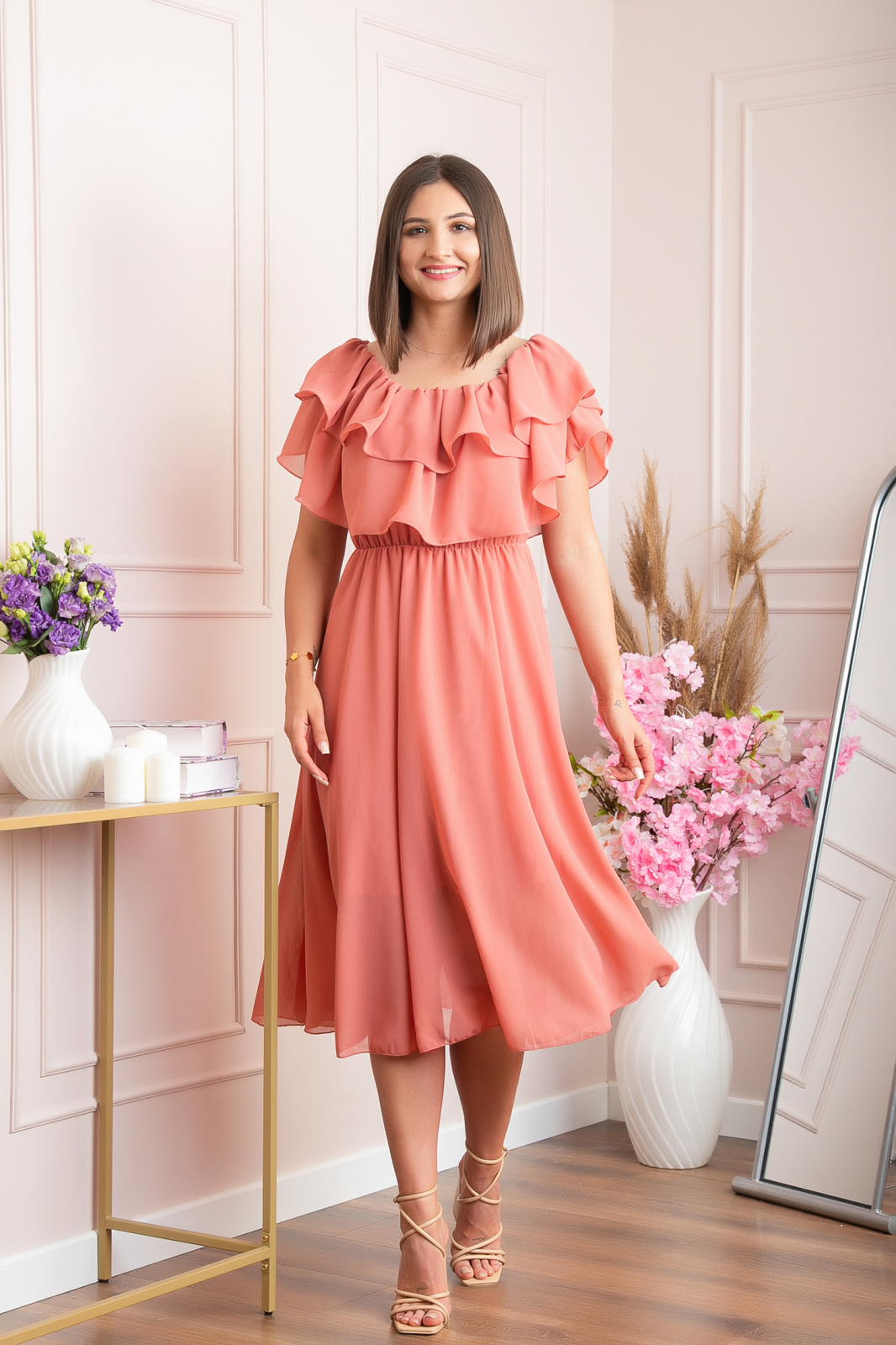 Rochie Joyce eleganta din voal cu volane - Roz somon