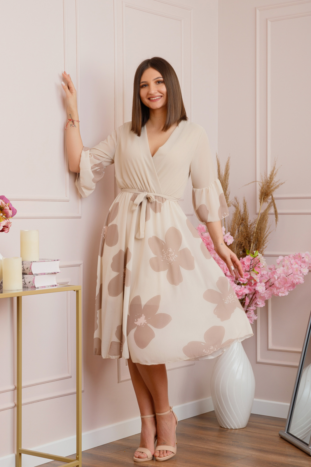 Rochia Lucy este alegerea perfecta pentru evenimente speciale precum nunti, botezuri sau alte ocazii festive. Confectionata din voal fin, cu dublura la interior, aceasta rochie nu este transparenta si ofera un plus de confort. Croiala sa midi avantajeaza orice silueta, in timp ce elasticul si cordonul din talie permit ajustarea perfecta. Decolteul in V, de tip petrecut, pune in valoare bustul, iar manecile trei sferturi lejere, cu terminatie cu volanas, completeaza designul elegant. Acest model de rochie eleganta iti asigura un look sofisticat si feminin, usor de asortat cu pantofi cu toc si accesorii rafinate.