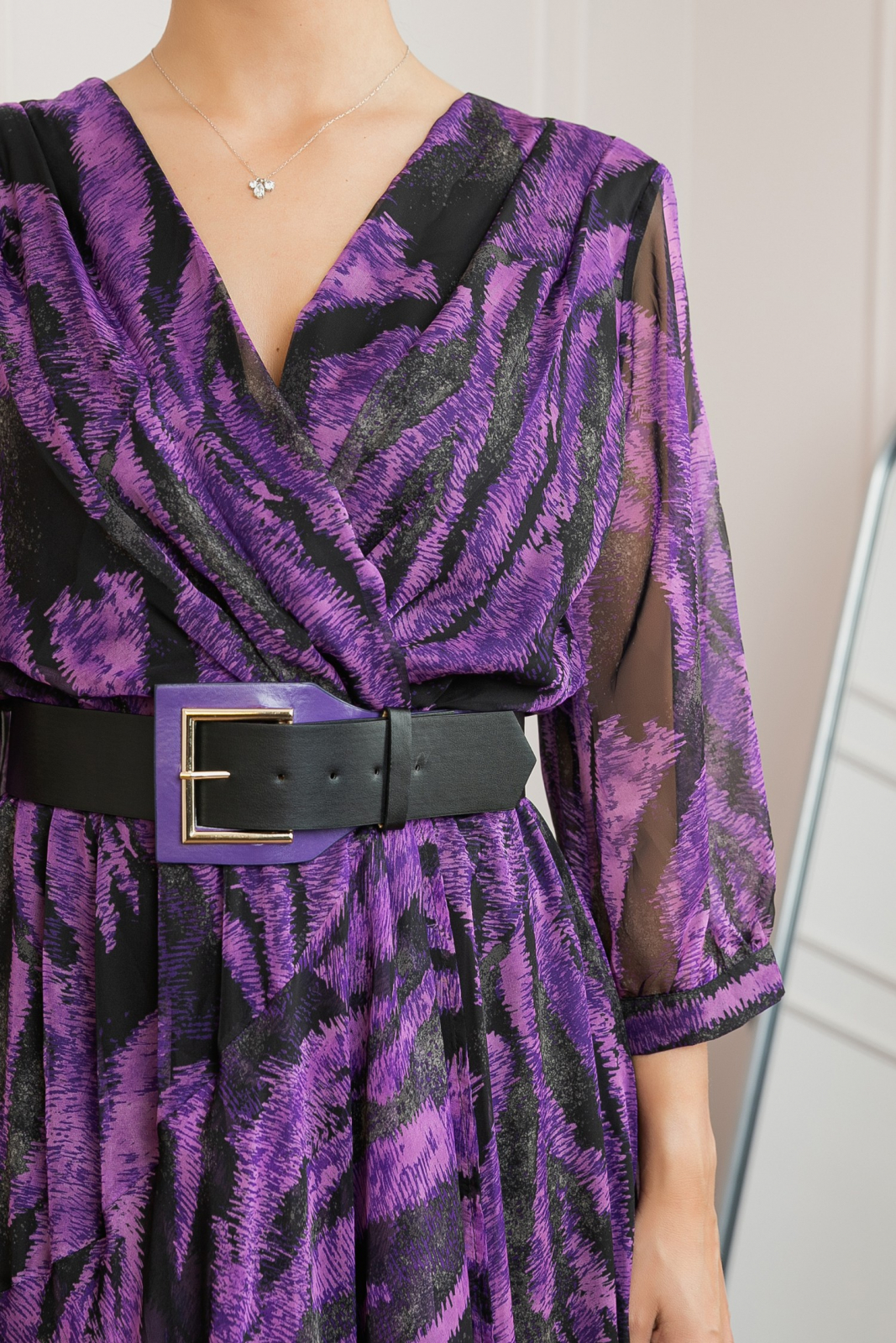 Aceasta rochie lunga eleganta cu un design animal print in nuante de mov este perfecta pentru a aduce un plus de rafinament si stil garderobei. Confectionata dintr-un material usor si fluid, rochia ofera un confort deosebit si o libertate de miscare excelenta. Decolteul in V si manecile trei sferturi adauga o nota sofisticata, in timp ce cureaua statement din talie accentueaza silueta, creand o imagine armonioasa si echilibrata. Rochia este ideala pentru evenimente speciale, petreceri sau iesiri in oras.