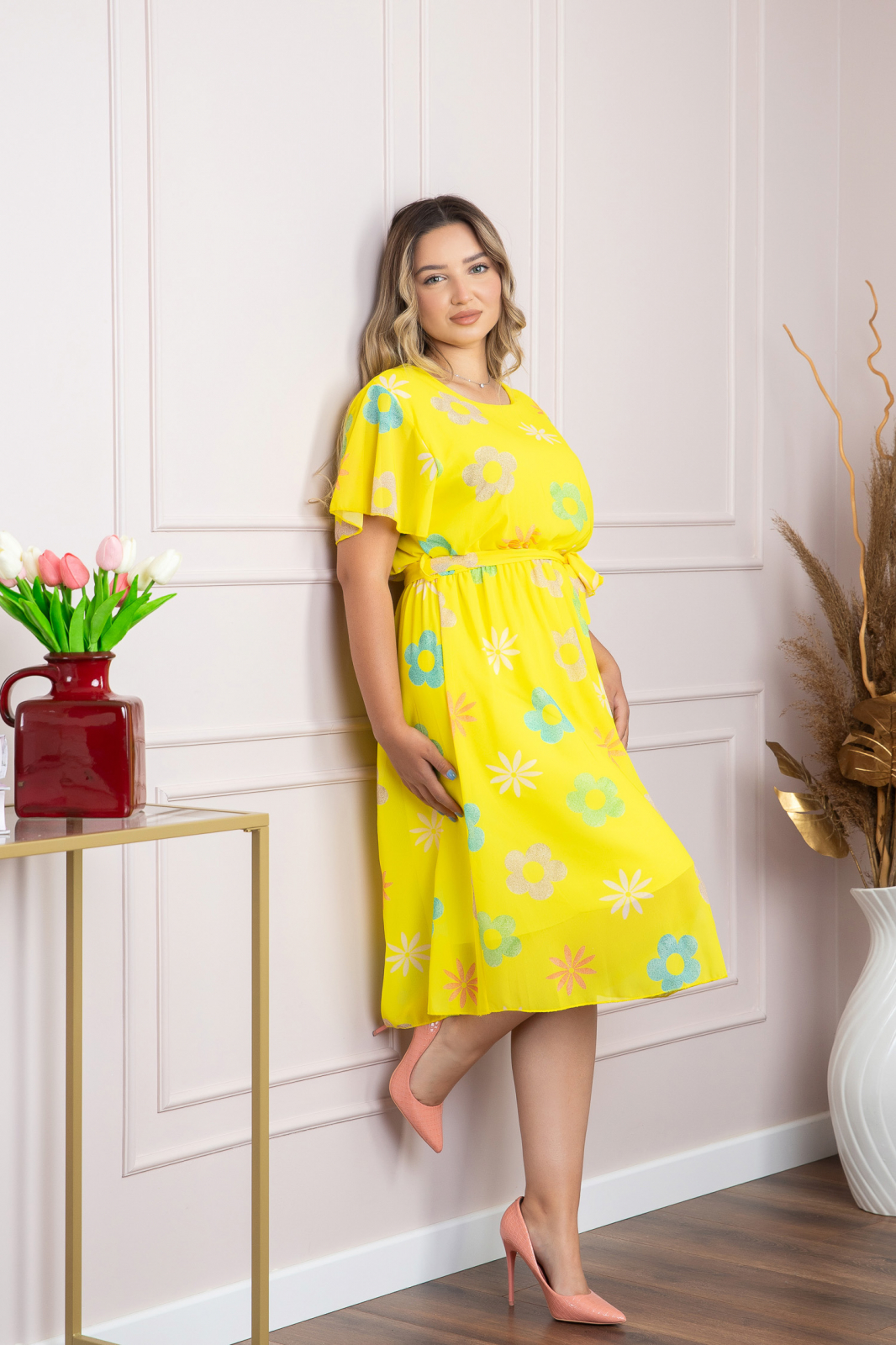 Rochie midi vibranta, de culoare galbena, perfecta pentru zilele insorite si pline de energie. Confectionata dintr-un material usor si confortabil, rochia prezinta un imprimeu floral jucaus in nuante pastelate de albastru, roz si verde, adaugand un plus de prospetime si veselie tinutei.