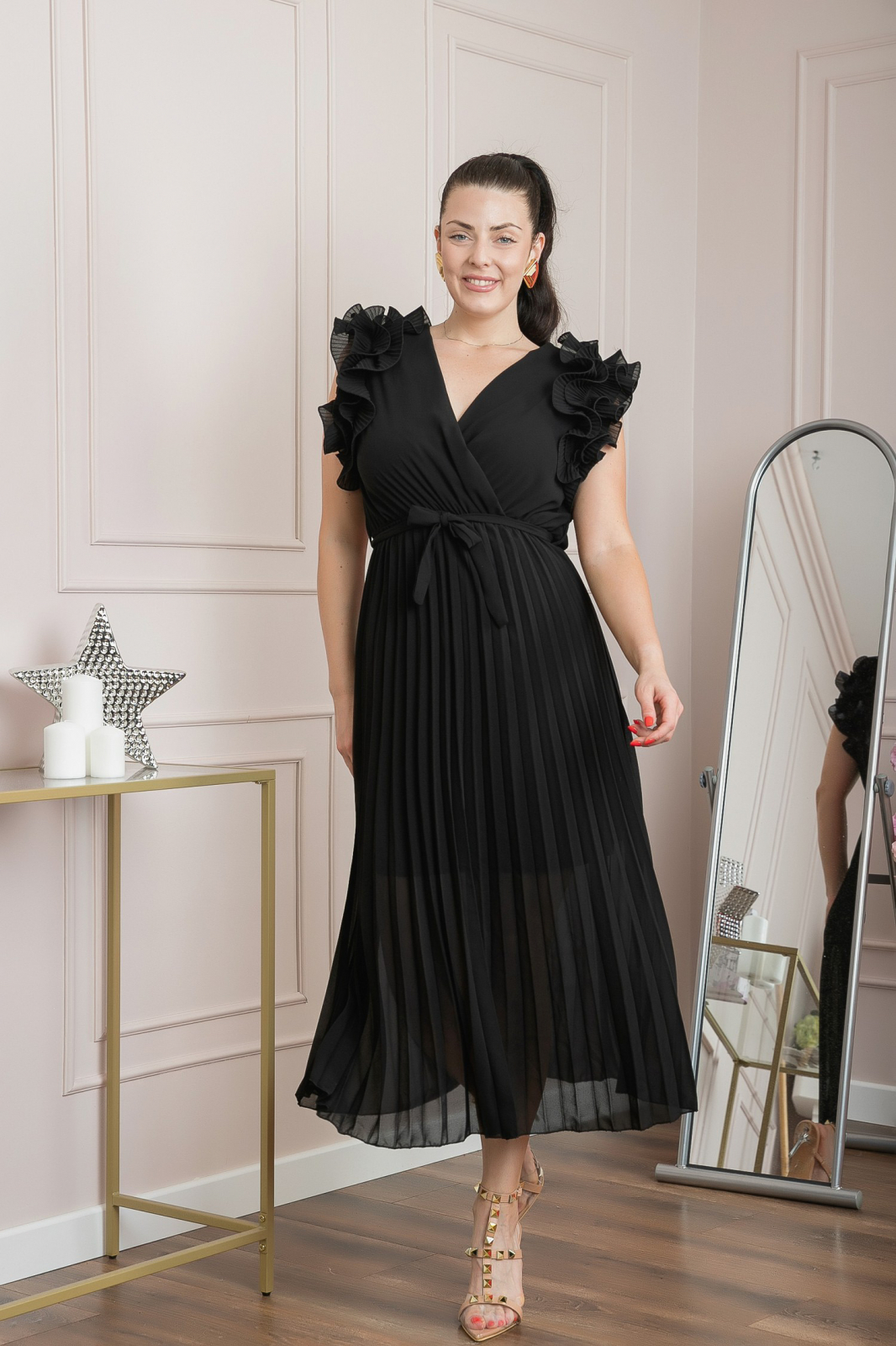 Rochie neagra plisata cu volane, ideala pentru evenimente speciale sau tinute elegante de zi cu zi. Realizata dintr-un material usor si confortabil, aceasta rochie ofera un aspect rafinat si modern. Volanele decorative de pe umeri adauga un plus de feminitate, in timp ce designul plisat aduce un aer sofisticat si stilat. Rochia este prevazuta cu cordon in talie, accentuand silueta intr-un mod delicat. Interiorul rochiei este captusit.