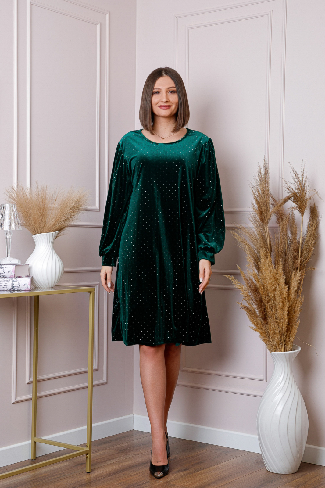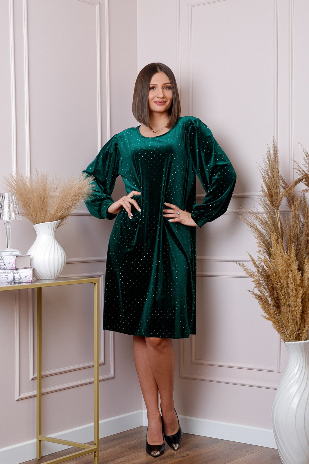 Manecile lungi bufante adauga un plus de rafinament, iar detaliile discrete cu strasuri ofera un efect usor stralucitor, perfect pentru serile festive sau evenimentele importante. Croiala lejera in forma de A este gandita pentru a complimenta formele feminine, oferind o tinuta fluida si echilibrata.