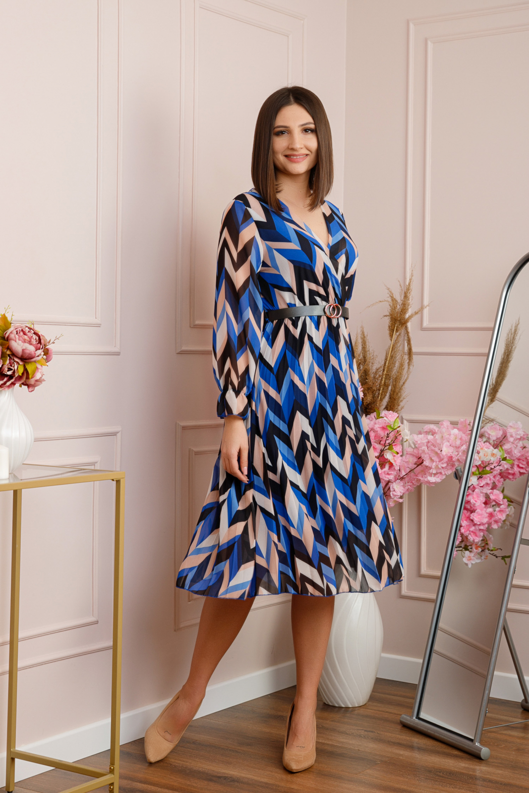 Rochie eleganta din voal, alegerea perfecta pentru evenimentele tale speciale, datorita croielii lejere si a designului geometric in nuante de albastru, bej, negru si roz piersica. Confectionata din voal subtire, cu captuseala delicata, asigura libertate de miscare si confort pe tot parcursul zilei. Modelul midi cu decolteu petrecut pune in valoare silueta, iar cureaua ajustabila din talie accentueaza feminitatea. Manecile lungi cu volanas completeaza aspectul rafinat, facand rochia potrivita atat pentru petreceri, cat si pentru evenimente formale. Rochia Samantha iti asigura un look sofisticat si versatil, usor de accesorizat cu pantofi cu toc sau sandale elegante.