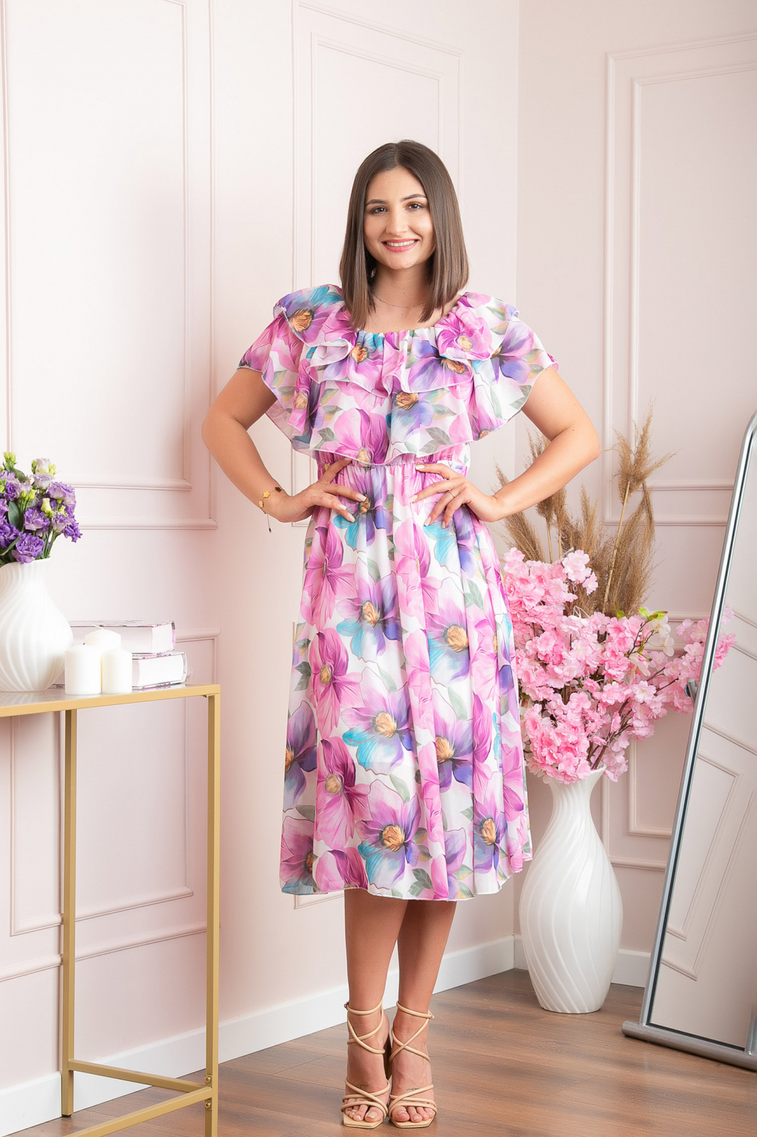Rochia Sarah este alegerea rafinata pentru evenimentele de zi sau seara, combinand feminitatea imprimeului floral cu lejeritatea voalului vaporos. Cele doua volane ample asezate pe bust creeaza un decolteu seducator, in timp ce banda elastica din talie evidentiaza silueta si ofera confort pe tot parcursul purtarii. Croiala midi in A permite materialului sa cada fluid, iar captuseala fina la interior asigura opacitate si libertate de miscare fara a compromite aerisirea rochiei. Designul fara fermoare faciliteaza imbracarea rapida, iar materialul nu se sifoneaza usor, transformand piesa intr-o rochie eleganta de ocazie ideala pentru nunta, botez, cununie civila, garden party sau orice eveniment sofisticat de vara.