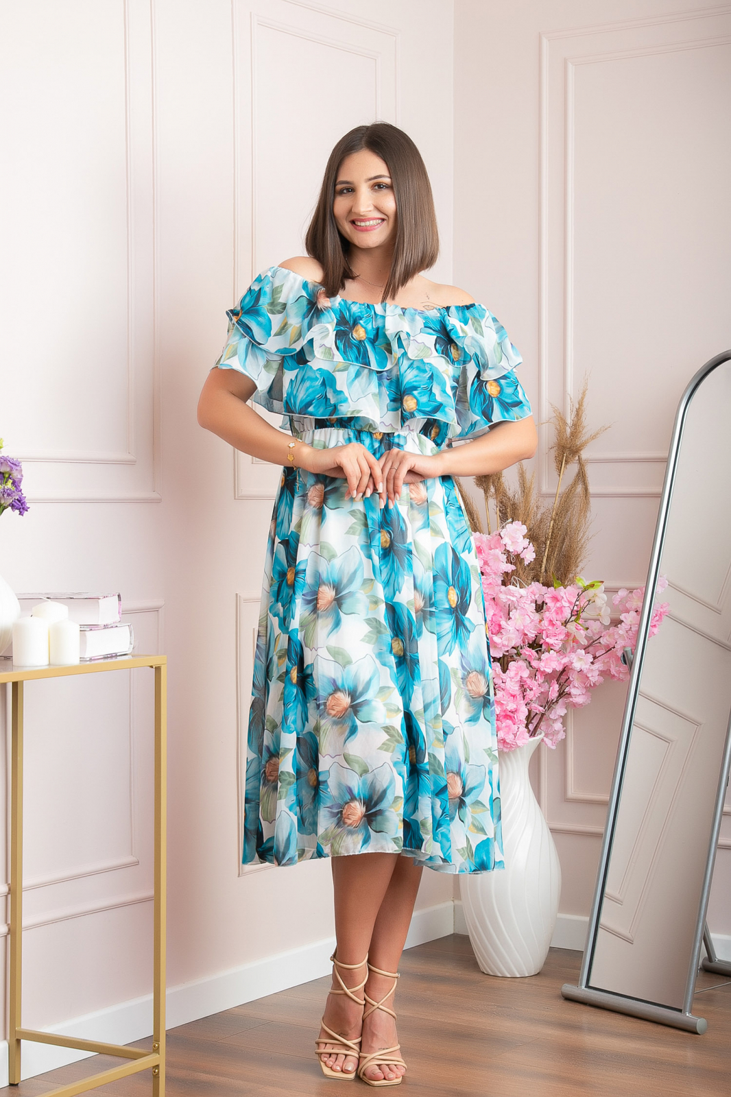 Rochia Sarah este alegerea rafinata pentru evenimentele de zi sau seara, combinand feminitatea imprimeului floral cu lejeritatea voalului vaporos. Cele doua volane ample asezate pe bust creeaza un decolteu seducator, in timp ce banda elastica din talie evidentiaza silueta si ofera confort pe tot parcursul purtarii. Croiala midi in A permite materialului sa cada fluid, iar captuseala fina la interior asigura opacitate si libertate de miscare fara a compromite aerisirea rochiei. Designul fara fermoare faciliteaza imbracarea rapida, iar materialul nu se sifoneaza usor, transformand piesa intr-o rochie eleganta de ocazie ideala pentru nunta, botez, cununie civila, garden party sau orice eveniment sofisticat de vara.