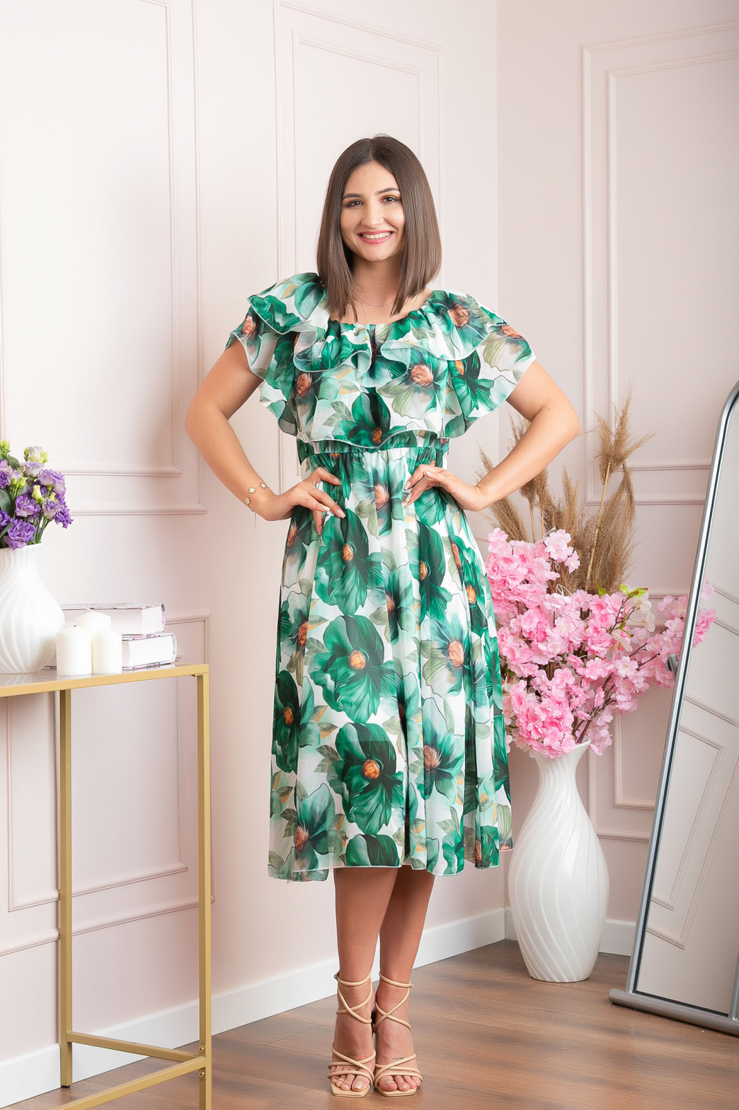 Rochia Sarah este alegerea rafinata pentru evenimentele de zi sau seara, combinand feminitatea imprimeului floral cu lejeritatea voalului vaporos. Cele doua volane ample asezate pe bust creeaza un decolteu seducator, in timp ce banda elastica din talie evidentiaza silueta si ofera confort pe tot parcursul purtarii. Croiala midi in A permite materialului sa cada fluid, iar captuseala fina la interior asigura opacitate si libertate de miscare fara a compromite aerisirea rochiei. Designul fara fermoare faciliteaza imbracarea rapida, iar materialul nu se sifoneaza usor, transformand piesa intr-o rochie eleganta de ocazie ideala pentru nunta, botez, cununie civila, garden party sau orice eveniment sofisticat de vara.