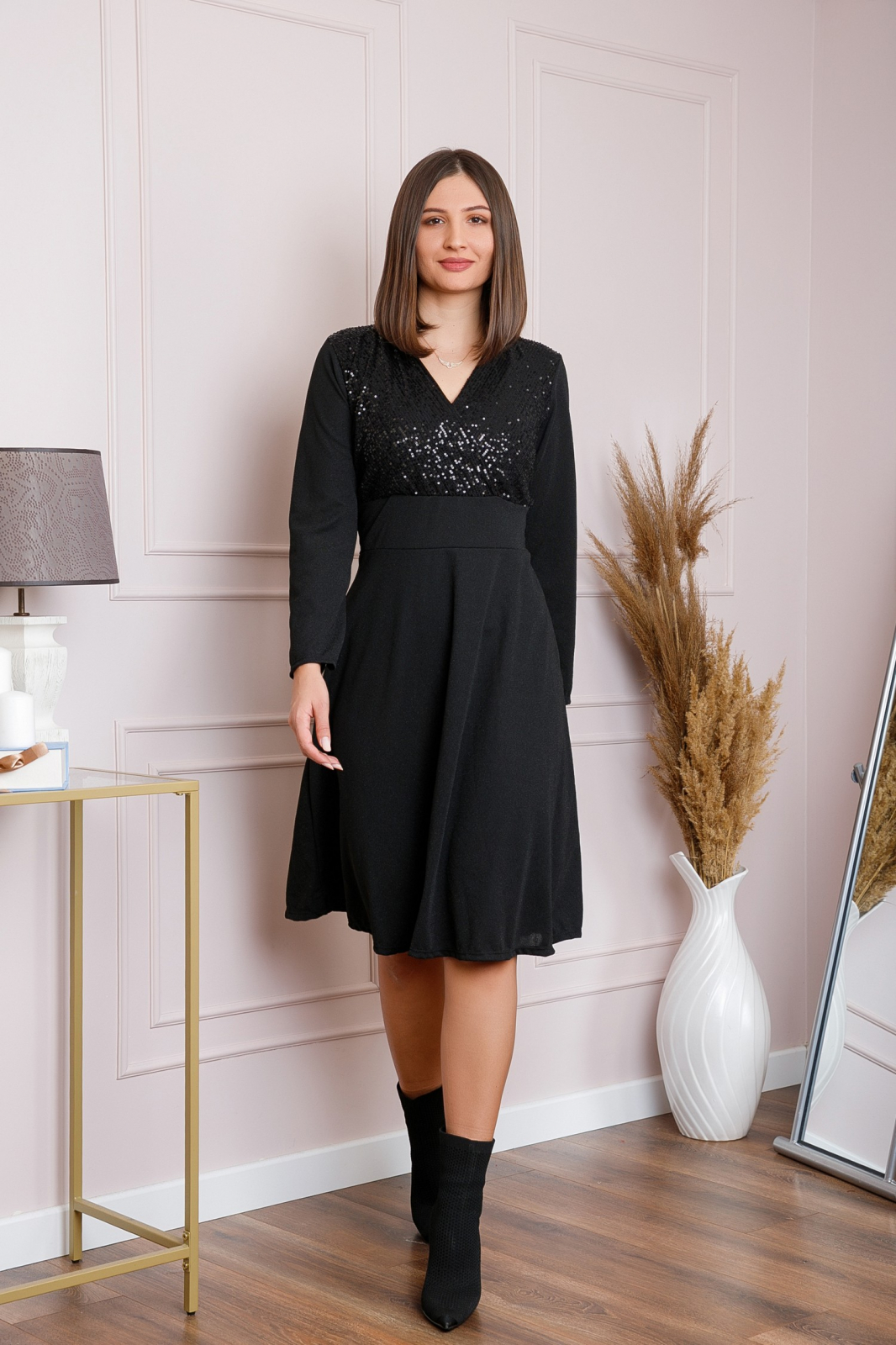 Rochie eleganta neagra, cu detalii cu paiete in zona bustului, ideala pentru evenimente speciale sau tinute de seara. Aceasta rochie ofera un look sofisticat si feminin, cu un croi lejer in partea de jos si decolteu in V, accentuand frumos silueta. Manecile lungi adauga un plus de rafinament, iar paietele confera un aspect stralucitor, perfect pentru o aparitie de efect. Materialul este placut la atingere si usor, asigurand confort pe toata durata purtarii.
