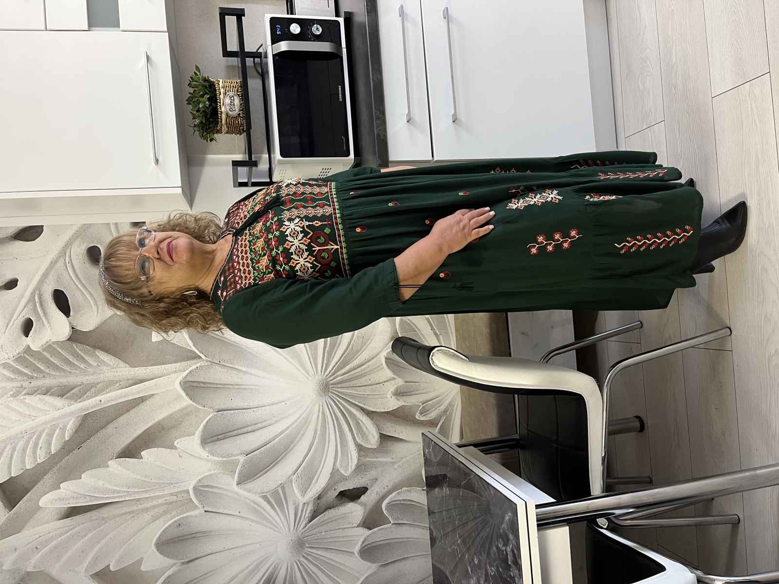 Rochie traditionala verde din celofibra cu maneca 3/4 si motiv traditional multicolor