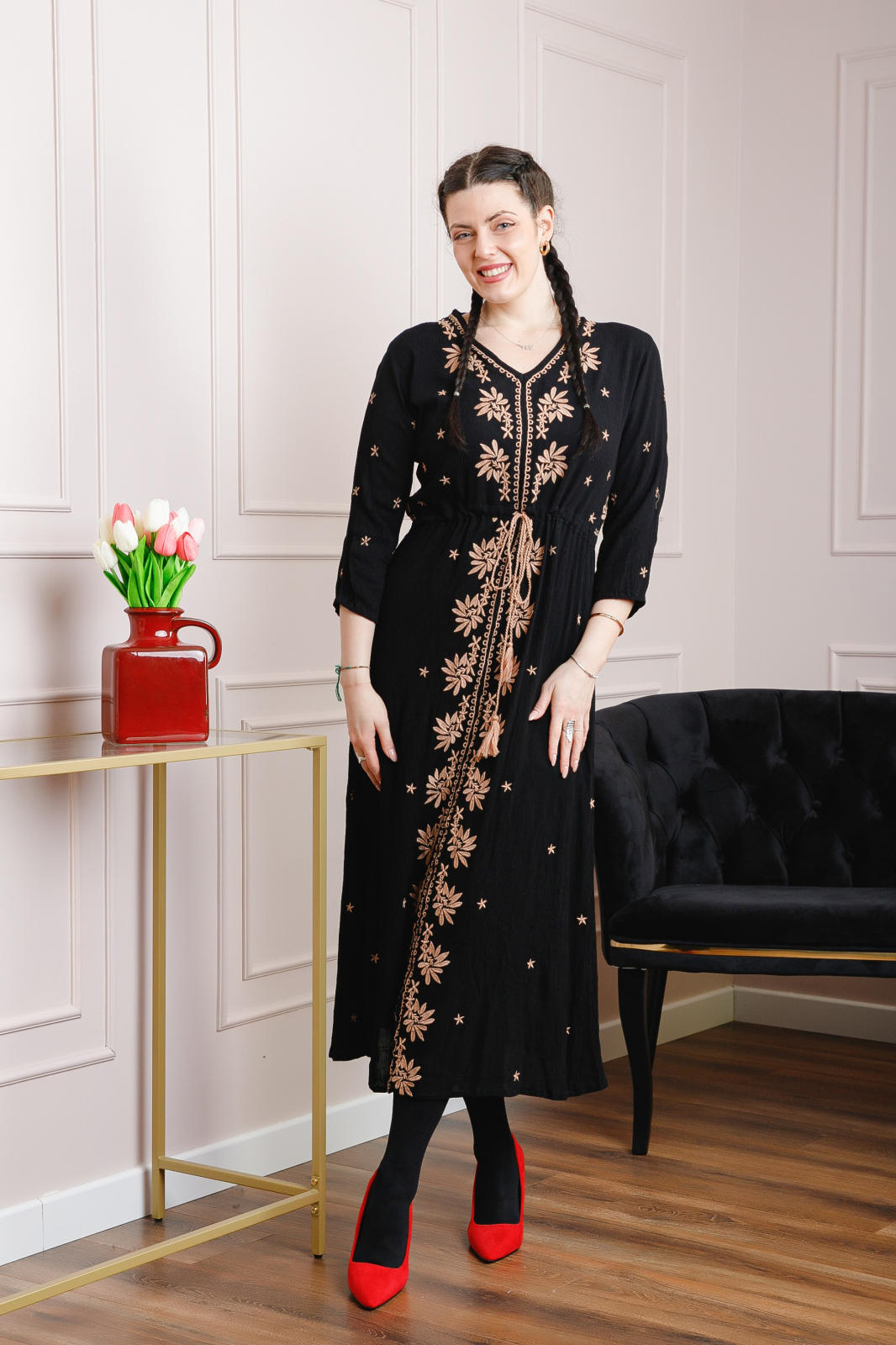 Rochie traditionala neagra din viscoza cu maneca 3/4 si motiv traditional crem.